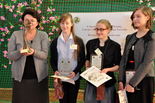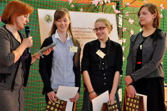Konkurs zakończył się galą wręczenia nagród najlepszym drużynom. I tak I miejsce zajęli uczniowie z Gimnazjum im. Zofii Nałkowskiej w Wołominie, II miejsce uczniowie z Gimnazjum w Klembowie, III miejsce uczniowie z Gimnazjum w Postoliskach. Statuetki i książki fundowne przez Radę Rodziców Zespołu Szkół w Strachówce i Stowarzyszenie Rzeczpospolita Norwidowska wywalczyły, Natalia Prusak i Aleksandra Zyskowska z Postolisk. Na prośbę publiczności i za zgodą organizatorów przyznana została nagroda publiczności. Otrzymała ją Klaudia Jóźwiak z Zespołu Szkół w Czarnej, za muzyczne wykonanie wiersza „W Weronie”.
