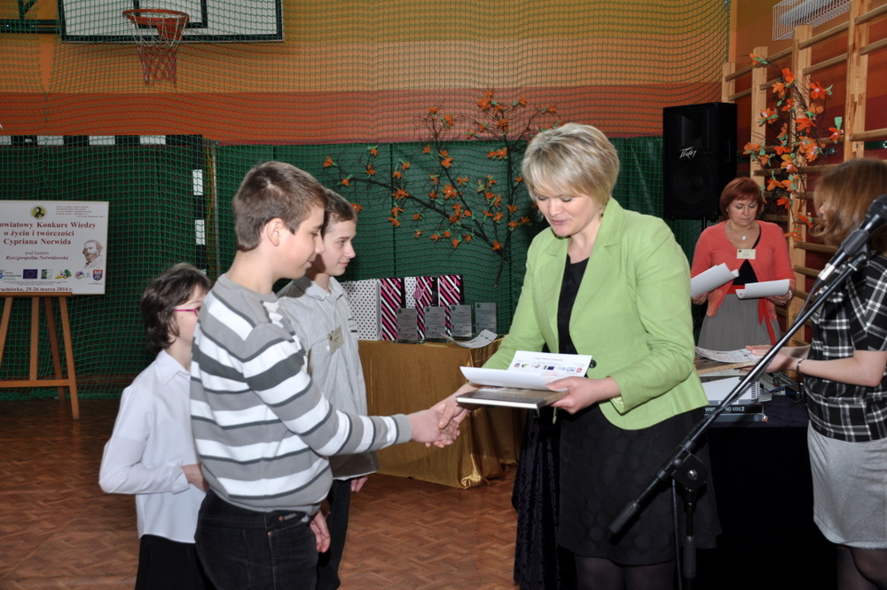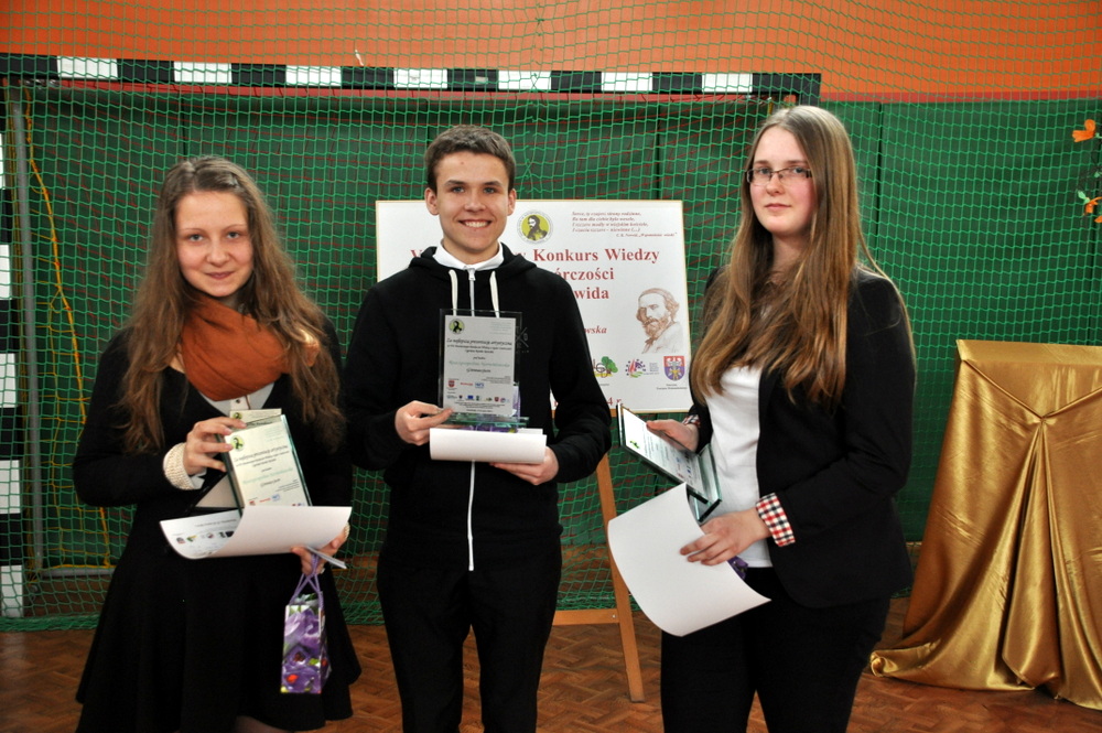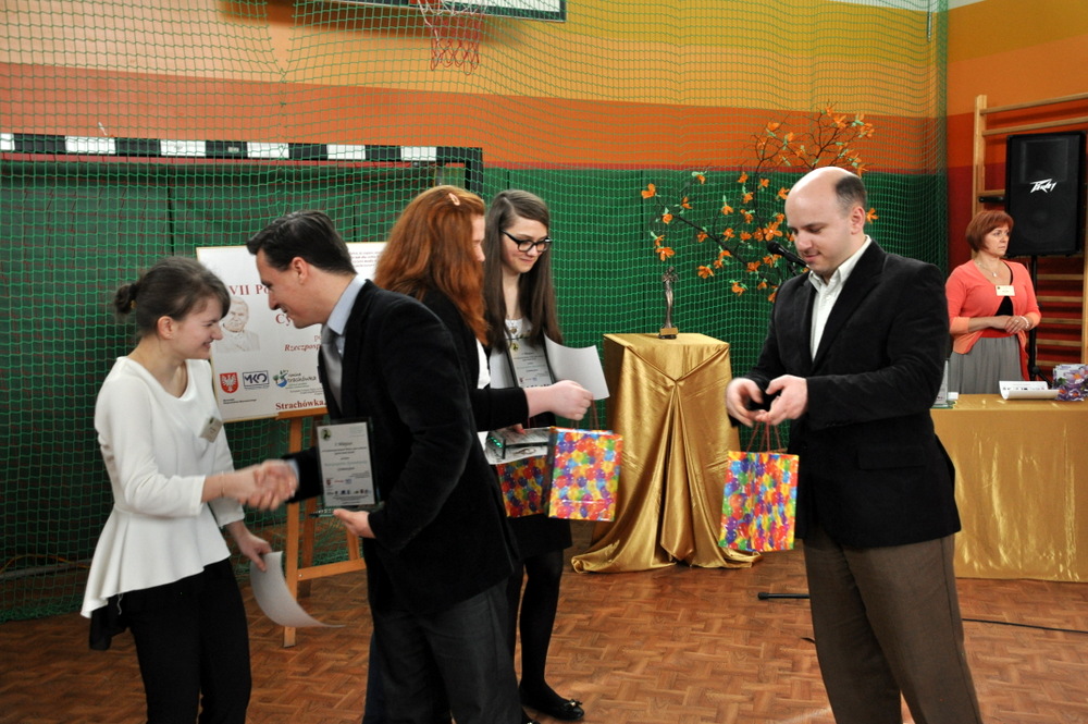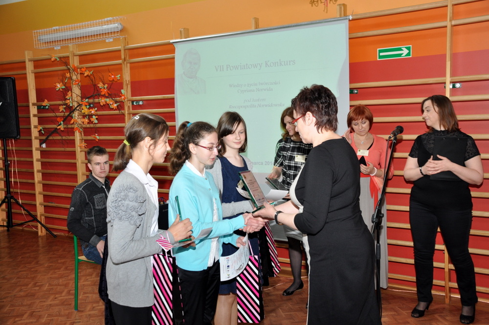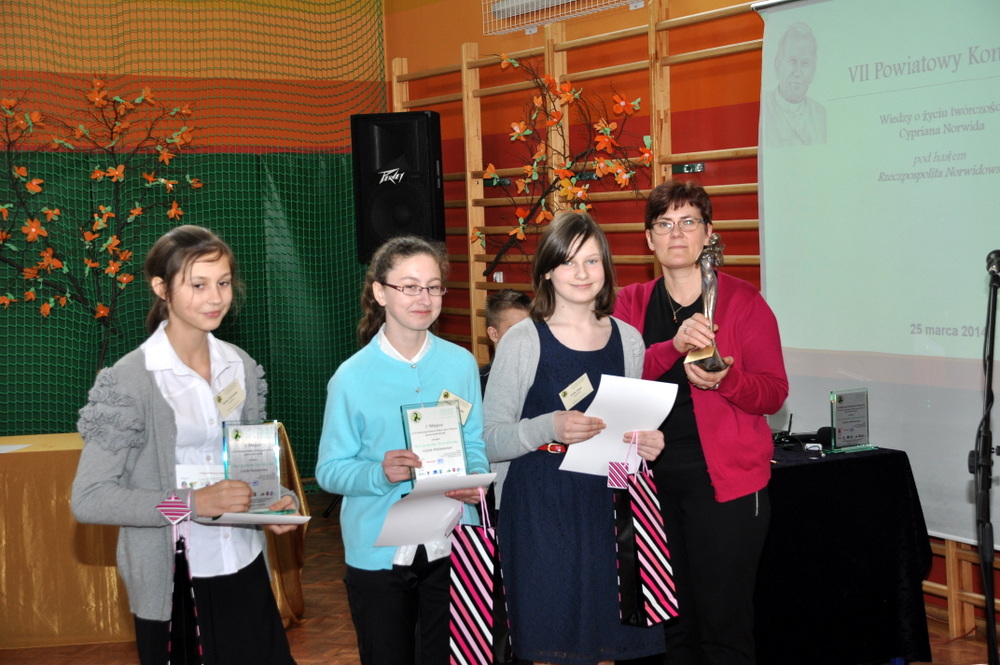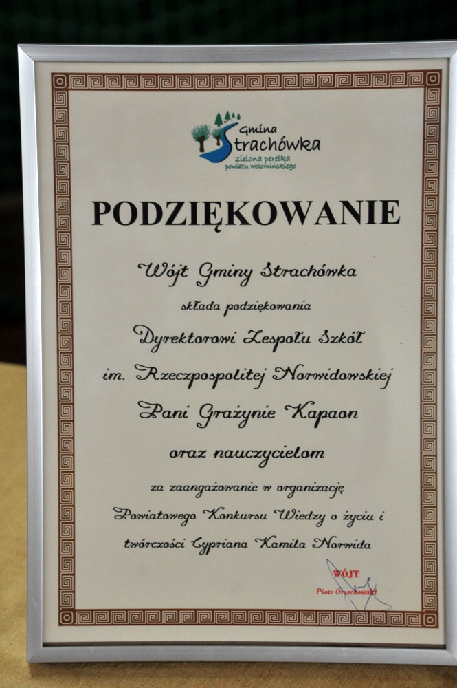 Wszyscy uczestnicy konkursu otrzymali pamiątkowe dyplomy, a zwycięzcy tablety, słuchawki, Mp4, książki, płyty zespołu De Press z poezją C Norwida, okolicznościowe statuetki. Tradycją konkursu jest, że zwycięska szkoła otrzymuje również piękną statuetkę. Kilka z nich powędrowało już do różnych szkół w naszym powiecie, w tym roku została w Strachówce. Pamiątkowe dyplomy, podziękowania otrzymali także opiekunowie drużyn, a szkoły publikację Rzeczpospolita Norwidowska. Tak piękna oprawa konkursu możliwa była dzięki patronatowi i finansowemu wsparciu Starosty Powiatu Wołomińskiego pana Piotra Uścińskiego, prezesa LGD „Równiny Wołomińskiej pana Rafała Rozpary, Wójta Gminy Strachówka pana Piotra Orzechowskiego. Konkurs objęty został również patronatem honorowym przez Marszałka Województwa Mazowieckiego pana Adama Struzika i Mazowieckiego Kuratora Oświaty pana Karola Semika. Dzięki sponsorom panu Krzysztofowi Kalinowskiemu i pani Agnieszce Piekut goście, nauczyciele i uczniowie, zaproszeni zostali na poczęstunek.