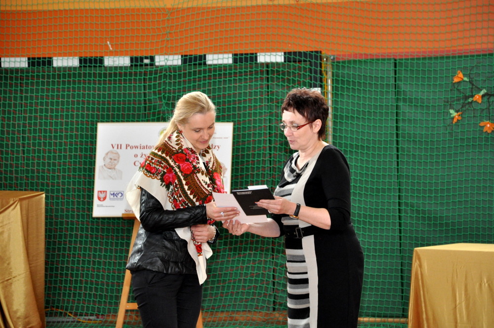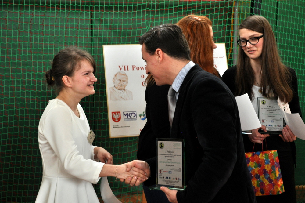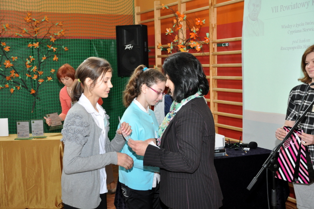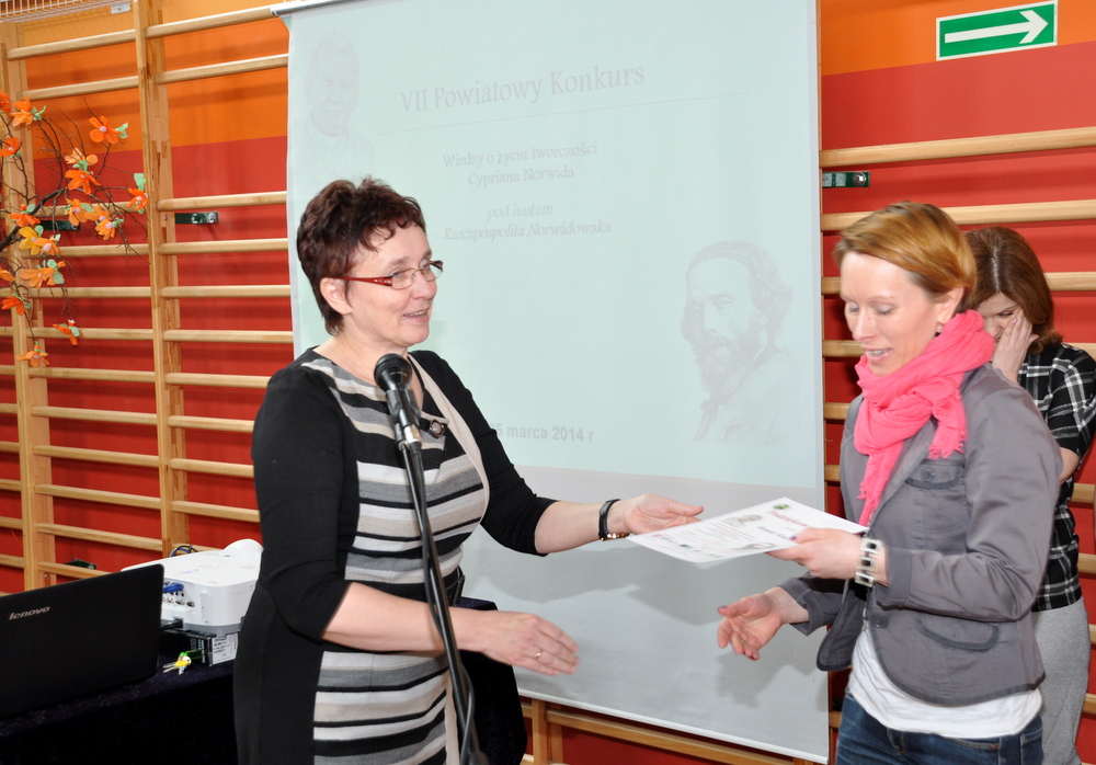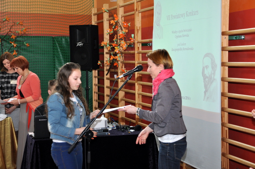 Wszyscy uczestnicy konkursu otrzymali pamiątkowe dyplomy, a zwycięzcy tablety, słuchawki, Mp4, książki, płyty zespołu De Press z poezją C Norwida, okolicznościowe statuetki. Tradycją konkursu jest, że zwycięska szkoła otrzymuje również piękną statuetkę. Kilka z nich powędrowało już do różnych szkół w naszym powiecie, w tym roku została w Strachówce. Pamiątkowe dyplomy, podziękowania otrzymali także opiekunowie drużyn, a szkoły publikację Rzeczpospolita Norwidowska. Tak piękna oprawa konkursu możliwa była dzięki patronatowi i finansowemu wsparciu Starosty Powiatu Wołomińskiego pana Piotra Uścińskiego, prezesa LGD „Równiny Wołomińskiej pana Rafała Rozpary, Wójta Gminy Strachówka pana Piotra Orzechowskiego. Konkurs objęty został również patronatem honorowym przez Marszałka Województwa Mazowieckiego pana Adama Struzika i Mazowieckiego Kuratora Oświaty pana Karola Semika. Dzięki sponsorom panu Krzysztofowi Kalinowskiemu i pani Agnieszce Piekut goście, nauczyciele i uczniowie, zaproszeni zostali na poczęstunek.