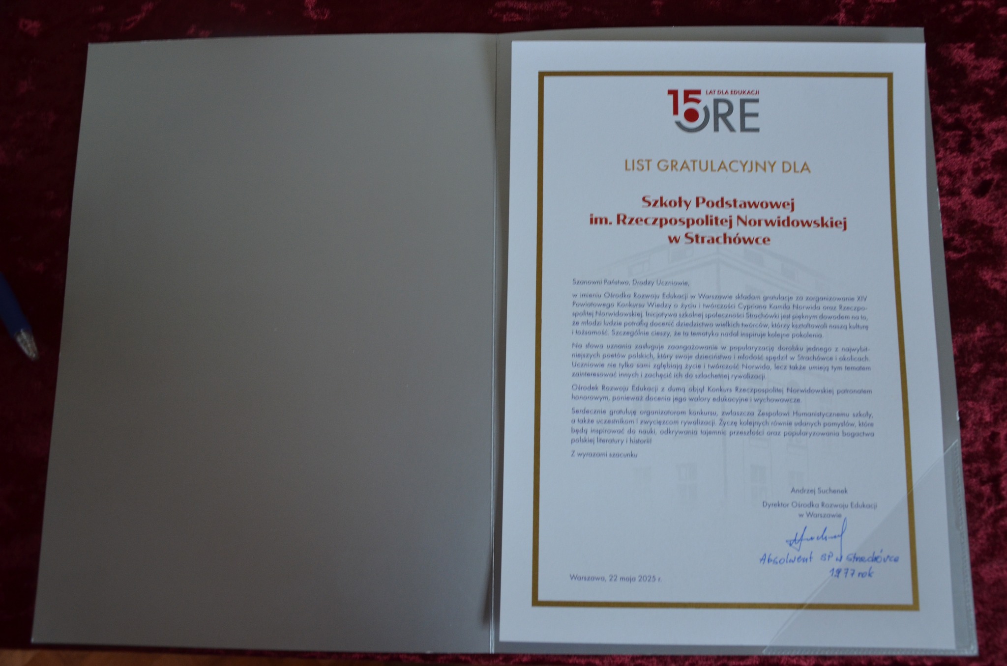 22 maja 2025 r. w naszej szkole odbył się XIV Powiatowy Konkurs Wiedzy o życiu i twórczości Cypriana Norwida oraz Rzeczpospolitej Norwidowskiej. Organizatorem konkursu była Szkoła Podstawowa w Strachówce i Stowarzyszenie Rzeczpospolita Norwidowska, a współorganizatorem Powiat Wołomiński i Gmina Strachówka. W tegorocznym konkursie wzięło udział 7 drużyn ze szkół podstawowych z powiatu wołomińskiego i jedna szkoła z powiatu mińskiego: Zielonki, Słupna, Wszebor, Radzymina, Jadowa, Stanisławowa i Strachówki. Łącznie w wydarzeniu uczestniczyło 21uczniów i 9 nauczycieli-opiekunów.