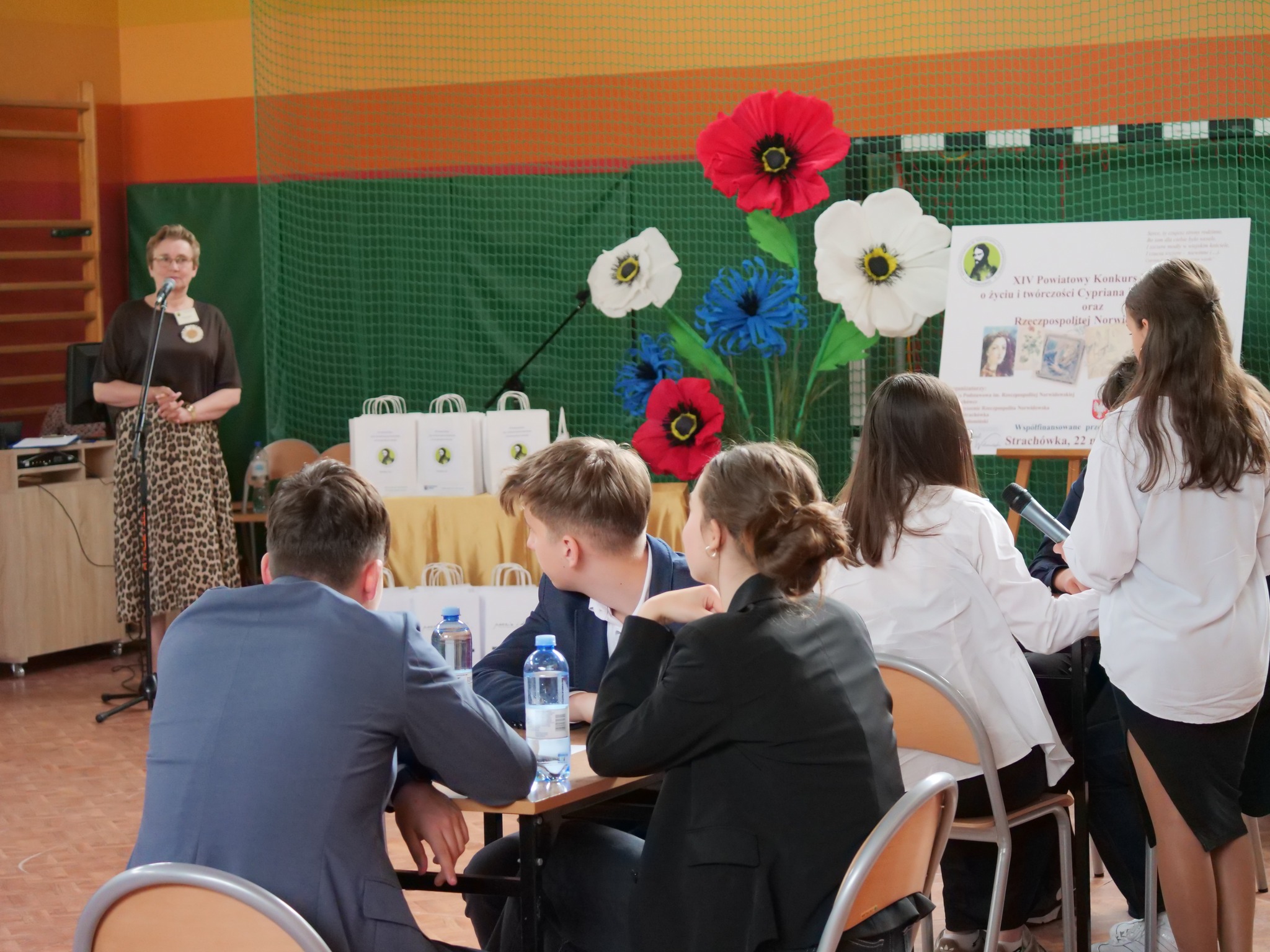 Konkurs składał się z dwóch części. W pierwszej - wiedzowej uczestnicy mierzyli się w czterech konkurencjach. Różnorodne zadania pozwalały wykazać się wiedzą na temat życia i twórczości Cypriana Norwida. Odpowiedzi oceniało jury w składzie: p. Katarzyna Pazio – wicestarosta Powiatu Wołomińskiego, p. Małgorzata Szeja – zastępca dyrektora Ośrodka Rozwoju Edukacji, p. Jacenty Matysiak - dyrektor Muzeum Cypriana Norwida w Dębinkach, p. Anna Gołoś – kierownik Gminnej Biblioteki Publicznej w Strachówce.