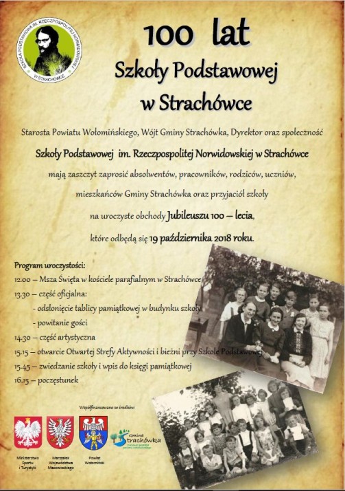 19 października 2018 r. na długo pozostanie w pamięci uczniów, rodziców, nauczycieli, pracowników naszej szkoły. W tym dniu świętowaliśmy Jubileusz 100-lecia Szkoły Podstawowej w Strachówce od 2008 r. noszącej imię Rzeczpospolitej Norwidowskiej. Uroczystość rozpoczęła się Mszą Świętą w kościele parafialnym p.w. Wniebowzięcia Najświętszej Maryi Panny w Strachówce. Eucharystię w intencji całej społeczności szkoły od 1918 r. koncelebrowali ks. proboszcz Mieczysław Jerzak i ks. Fabian Powała, który uczył w naszej szkole religii. W modlitwie wziął udział ks. dziekan Bogdan Lewiński.