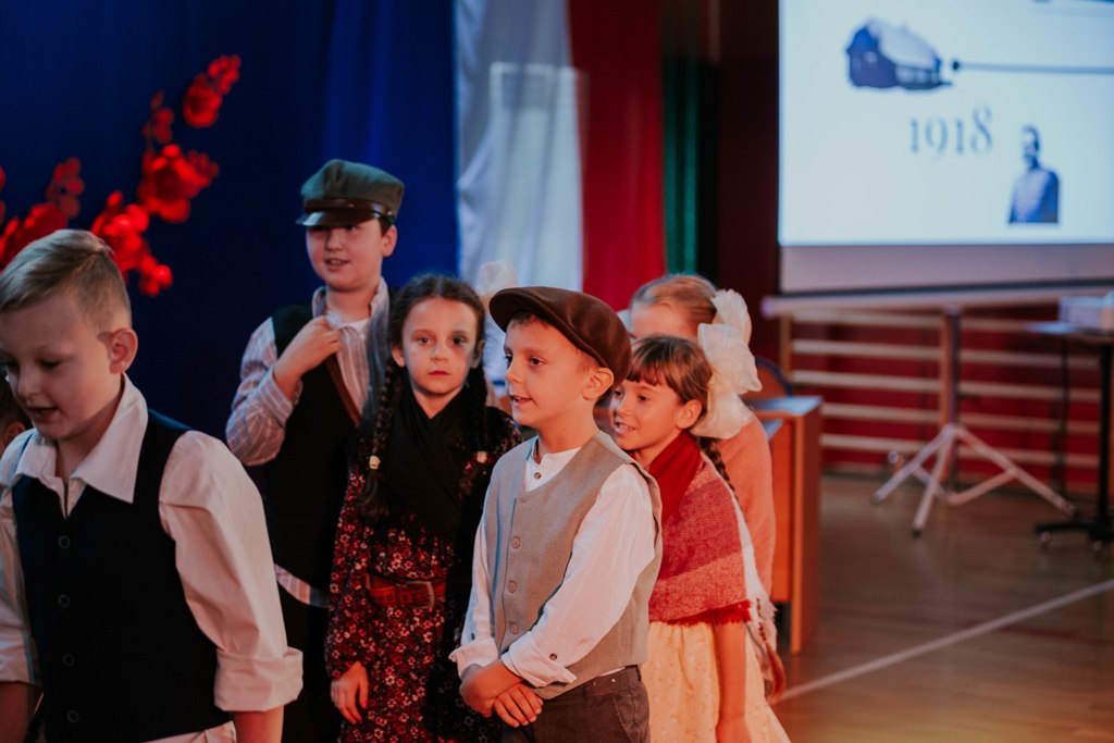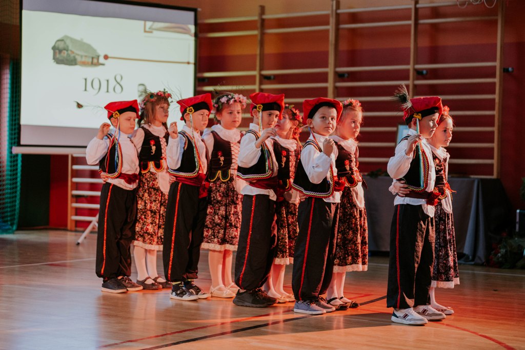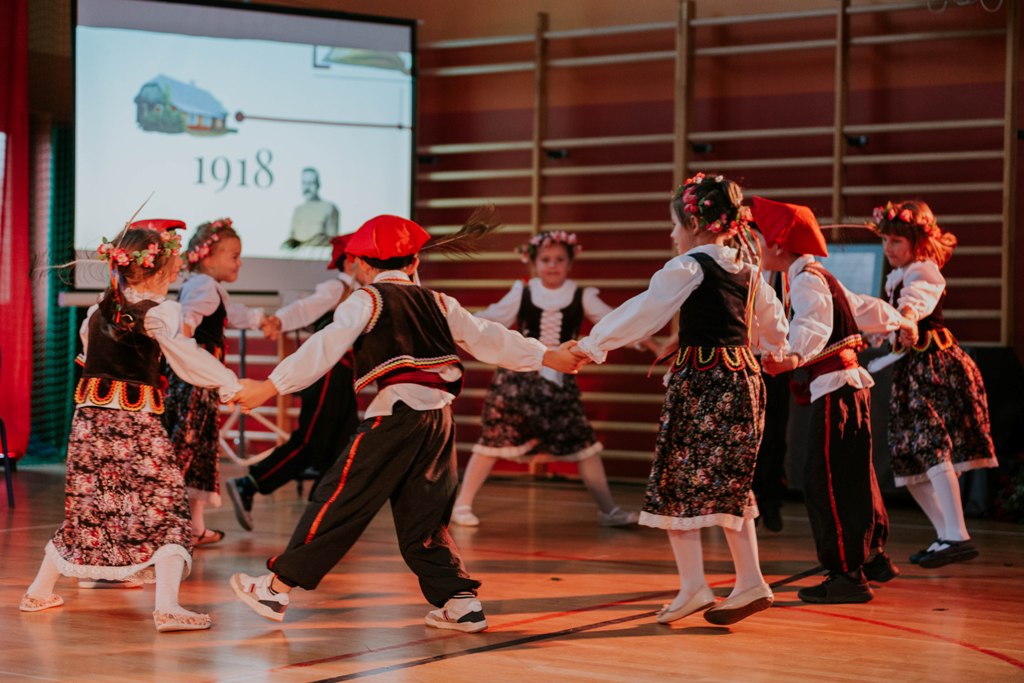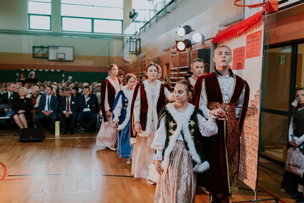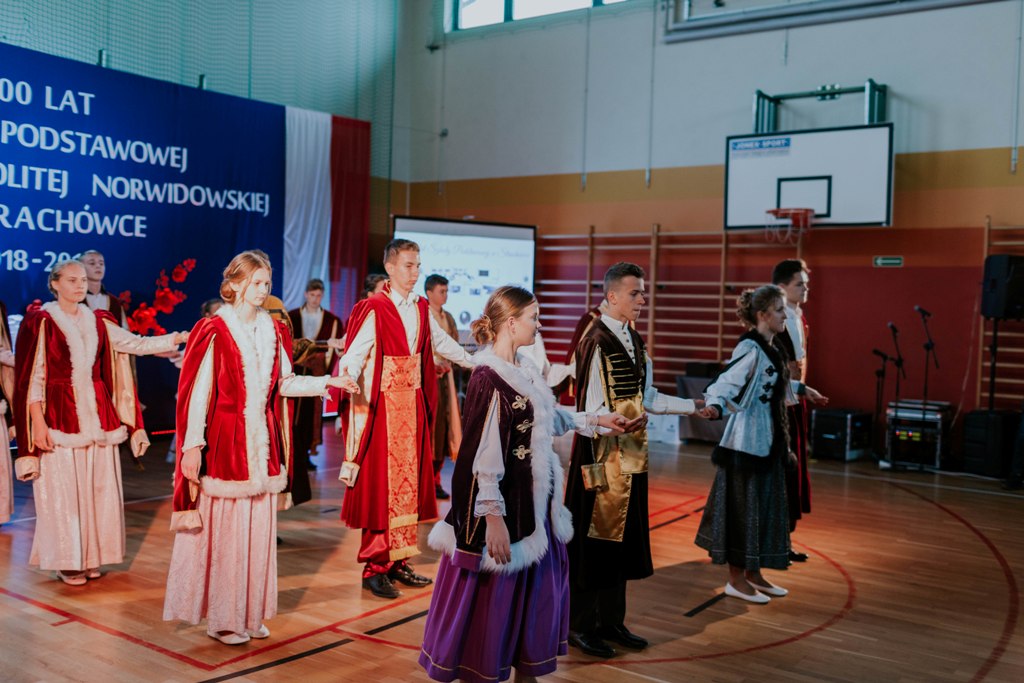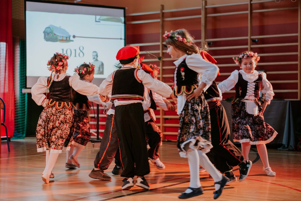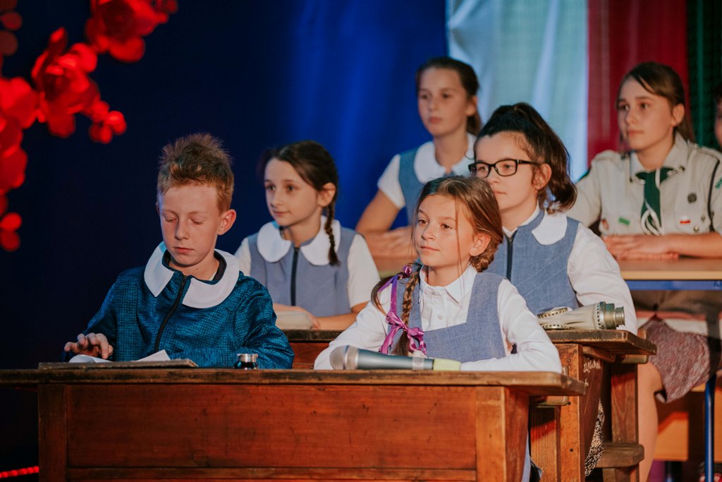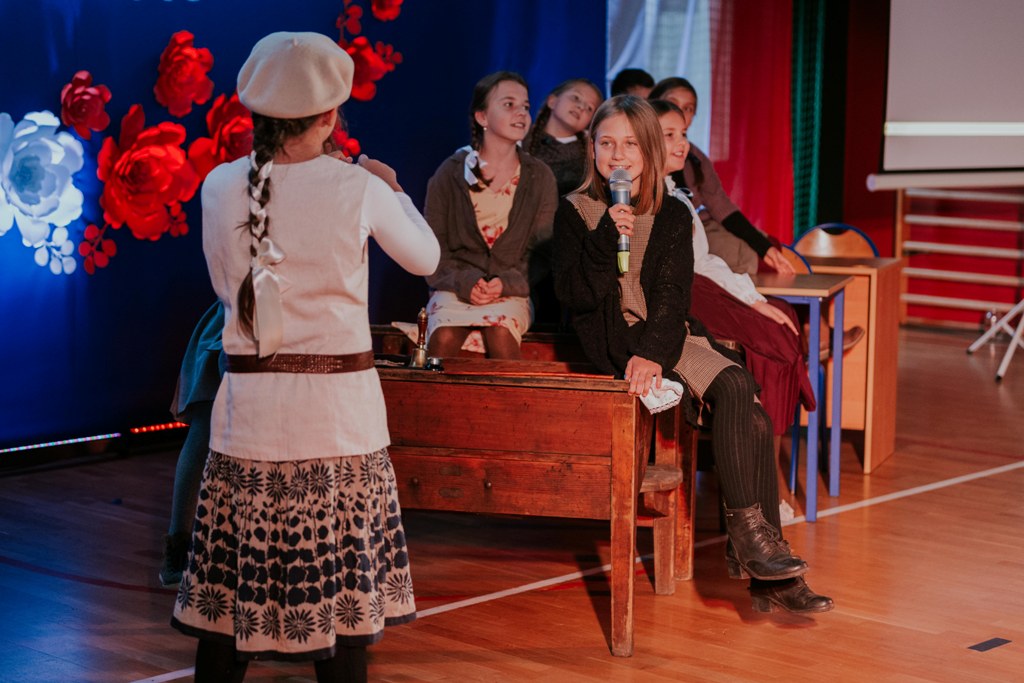 Kolejnym punktem uroczystości była prezentacja dziejów szkoły zrobiona na różne sposoby. Alicja Bujalska piosenką „Gdzie dziewczęta z tamtych lat” wyczarowała klimat przedwojennej Polski. Na prezentacji zgromadzeni zobaczyli karty z kroniki, zdjęcia, a dzieci w pierwszej scence teatralnej pokazały naukę kaligrafii. Konferansjerzy prowadzili nas przez kolejne okresy stuletniej historii szkoły. Nie zabrakło filmów z wywiadami, zakazanych piosenek, krakowiaka w wykonania pierwszaków, lekcji biologii i wierszy Cypriana Norwida, wzruszających piosenek „Twarze, twarze”, czy „Lubię wracać tam, gdzie byłem już” śpiewanych przez Ewelinę Cudną naszą absolwentkę. Końcowym akordem części artystycznej był przepiękny walc w wykonaniu uczniów z klasy VIII i III gimnazjum.
