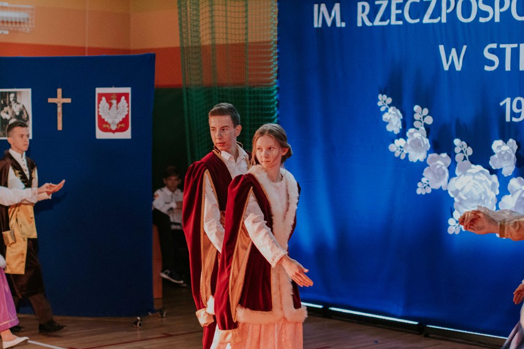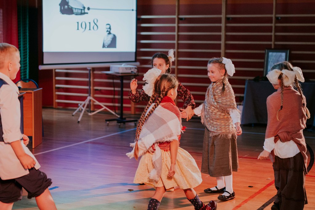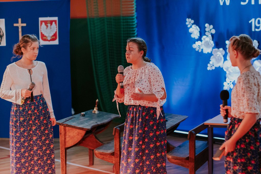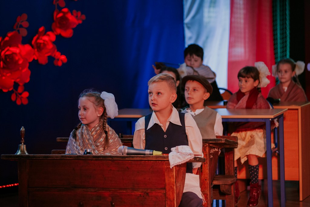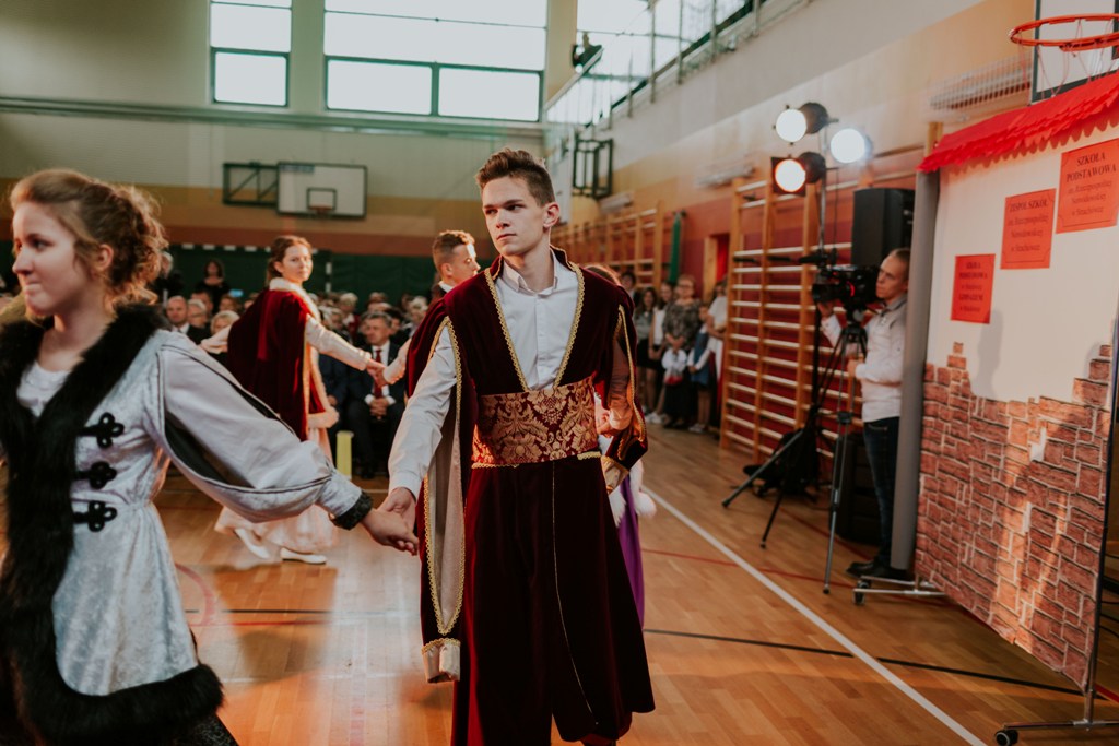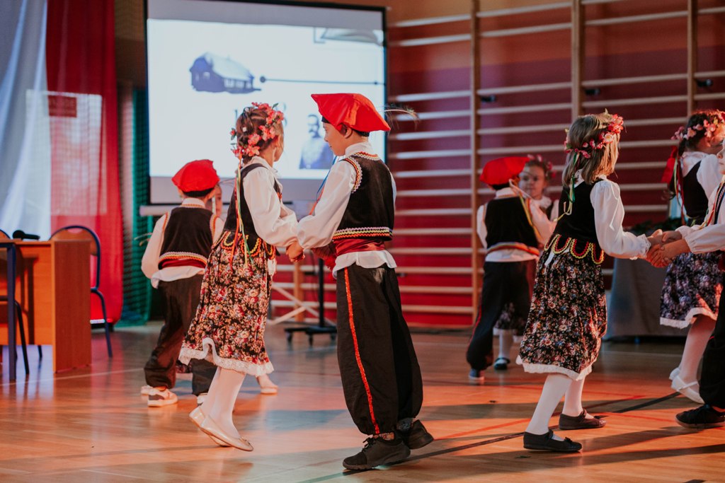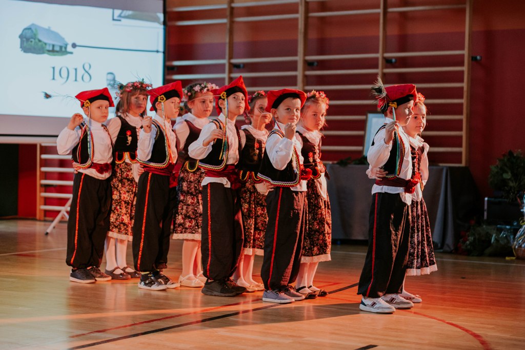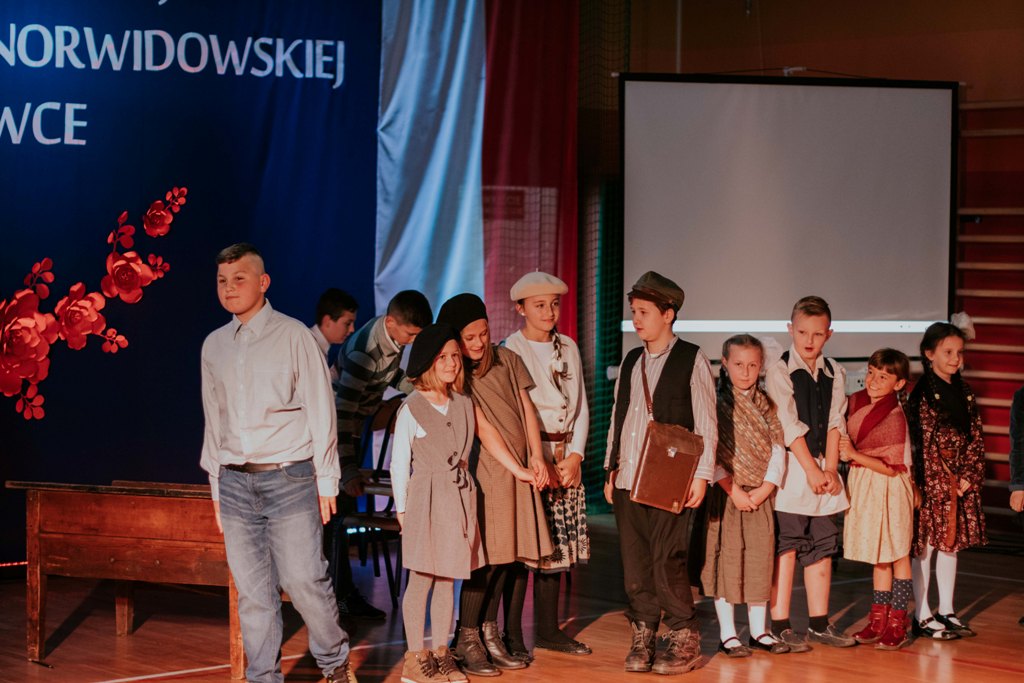 Kolejnym punktem uroczystości była prezentacja dziejów szkoły zrobiona na różne sposoby. Alicja Bujalska piosenką „Gdzie dziewczęta z tamtych lat” wyczarowała klimat przedwojennej Polski. Na prezentacji zgromadzeni zobaczyli karty z kroniki, zdjęcia, a dzieci w pierwszej scence teatralnej pokazały naukę kaligrafii. Konferansjerzy prowadzili nas przez kolejne okresy stuletniej historii szkoły. Nie zabrakło filmów z wywiadami, zakazanych piosenek, krakowiaka w wykonania pierwszaków, lekcji biologii i wierszy Cypriana Norwida, wzruszających piosenek „Twarze, twarze”, czy „Lubię wracać tam, gdzie byłem już” śpiewanych przez Ewelinę Cudną naszą absolwentkę. Końcowym akordem części artystycznej był przepiękny walc w wykonaniu uczniów z klasy VIII i III gimnazjum.