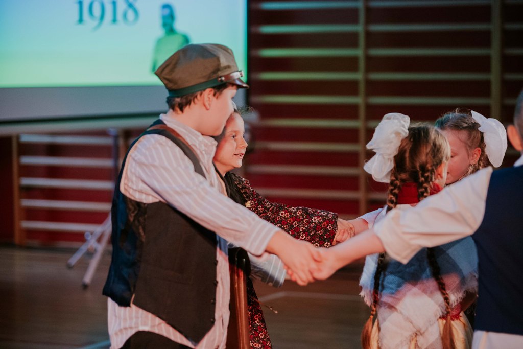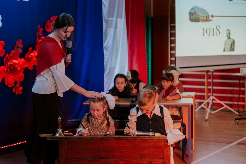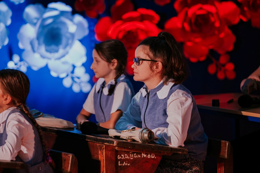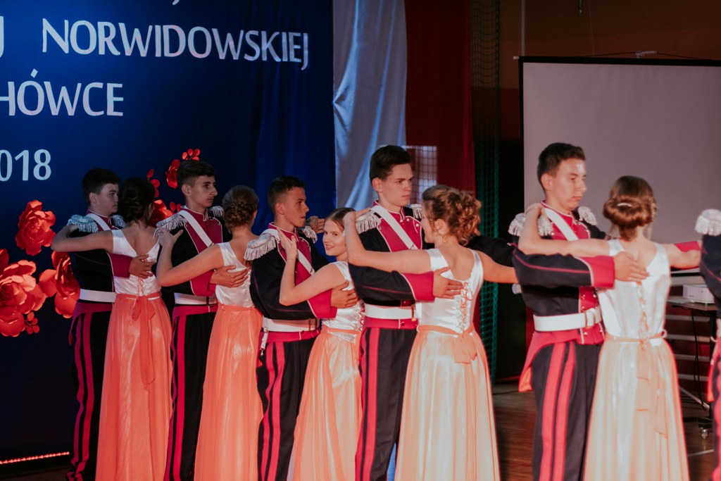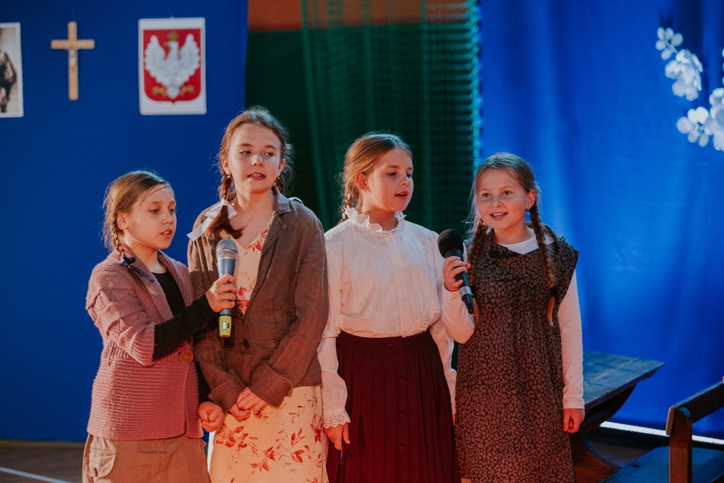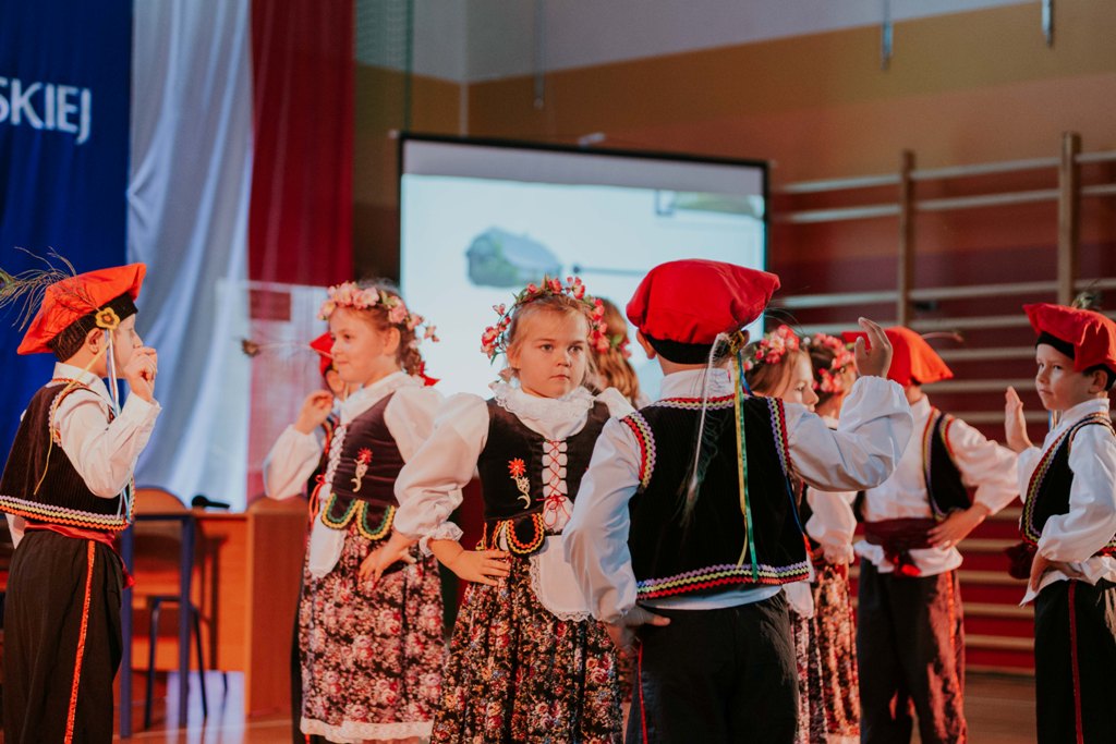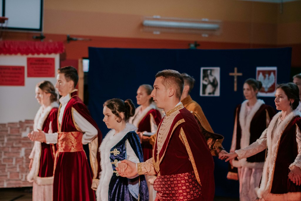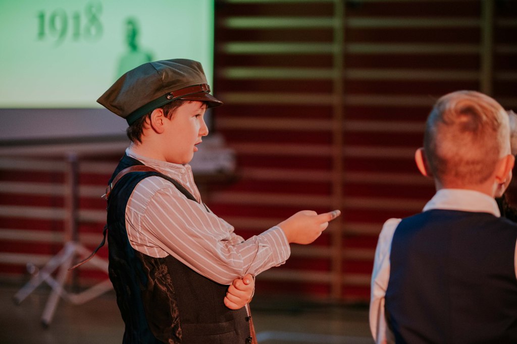 Kolejnym punktem uroczystości była prezentacja dziejów szkoły zrobiona na różne sposoby. Alicja Bujalska piosenką „Gdzie dziewczęta z tamtych lat” wyczarowała klimat przedwojennej Polski. Na prezentacji zgromadzeni zobaczyli karty z kroniki, zdjęcia, a dzieci w pierwszej scence teatralnej pokazały naukę kaligrafii. Konferansjerzy prowadzili nas przez kolejne okresy stuletniej historii szkoły. Nie zabrakło filmów z wywiadami, zakazanych piosenek, krakowiaka w wykonania pierwszaków, lekcji biologii i wierszy Cypriana Norwida, wzruszających piosenek „Twarze, twarze”, czy „Lubię wracać tam, gdzie byłem już” śpiewanych przez Ewelinę Cudną naszą absolwentkę. Końcowym akordem części artystycznej był przepiękny walc w wykonaniu uczniów z klasy VIII i III gimnazjum.