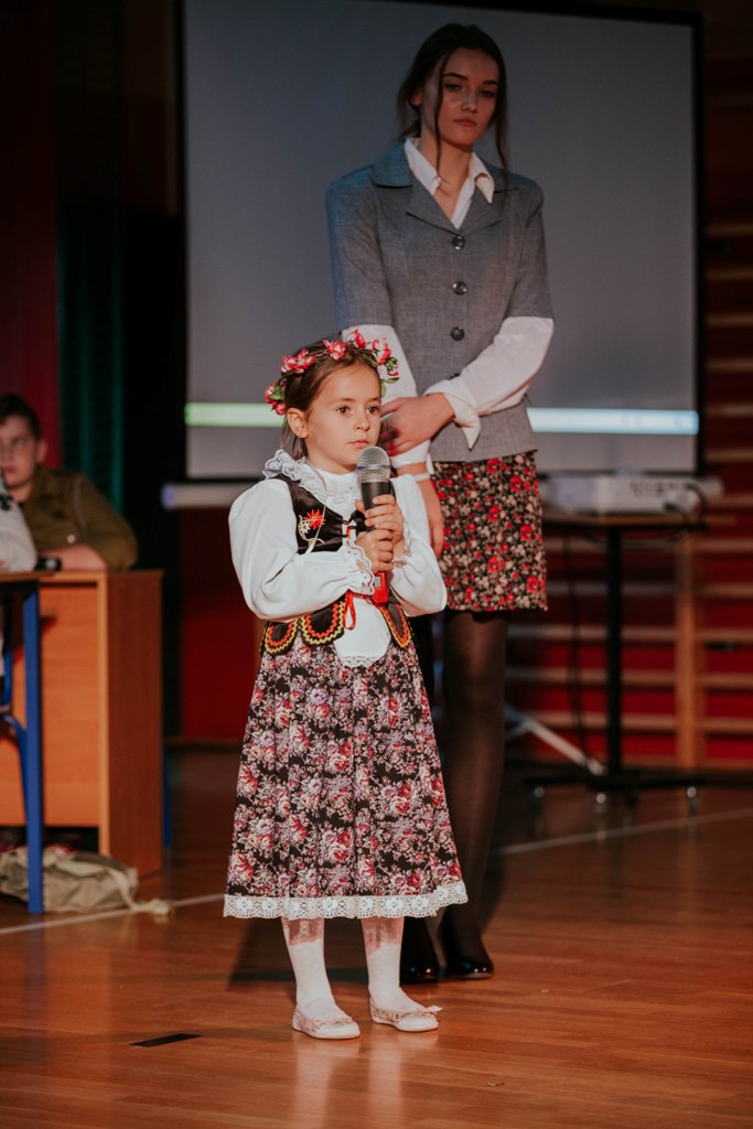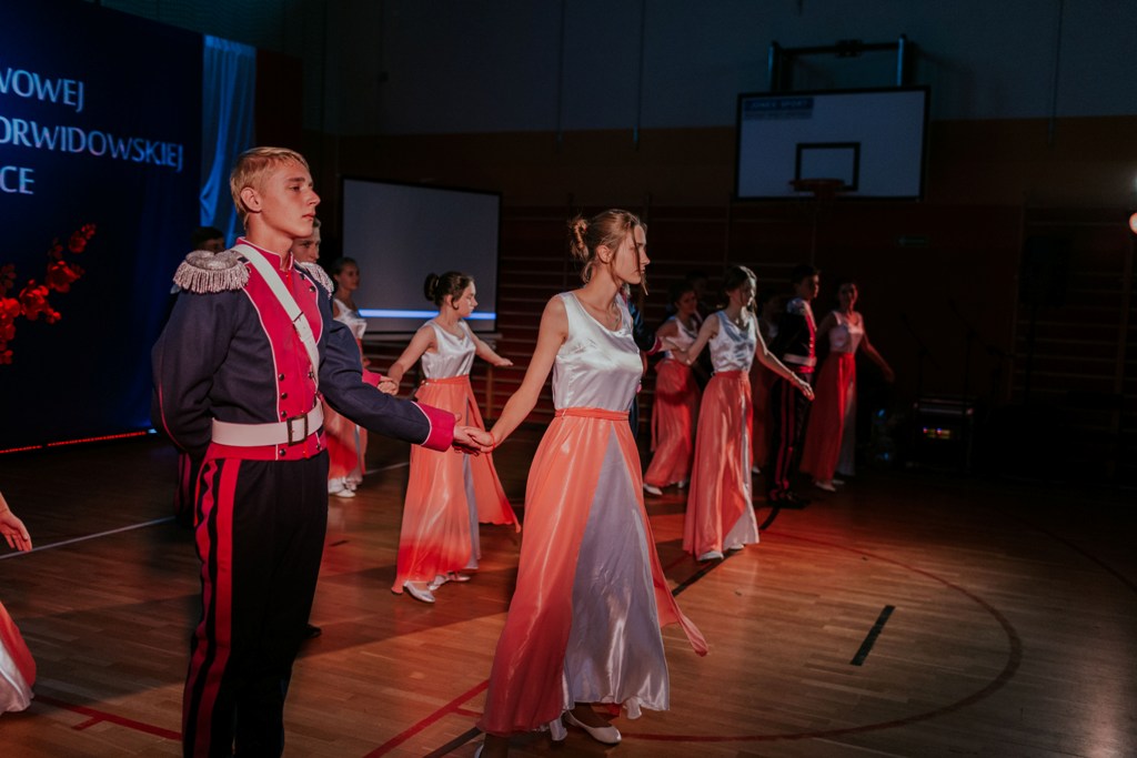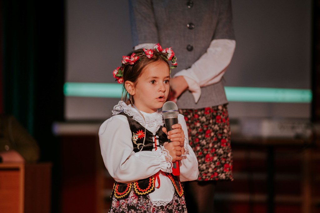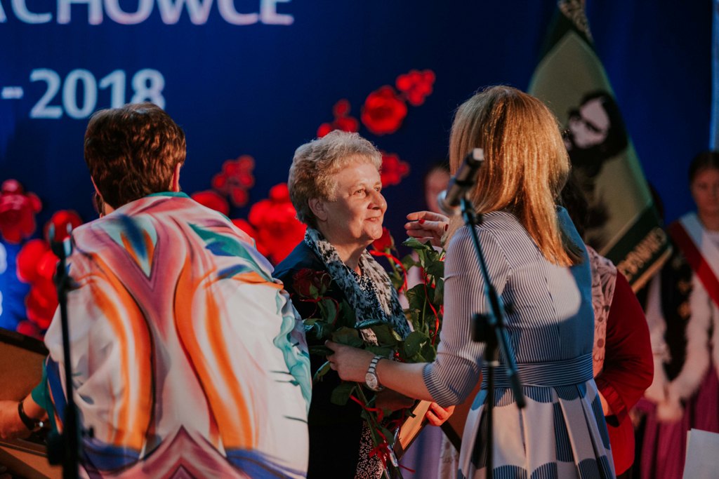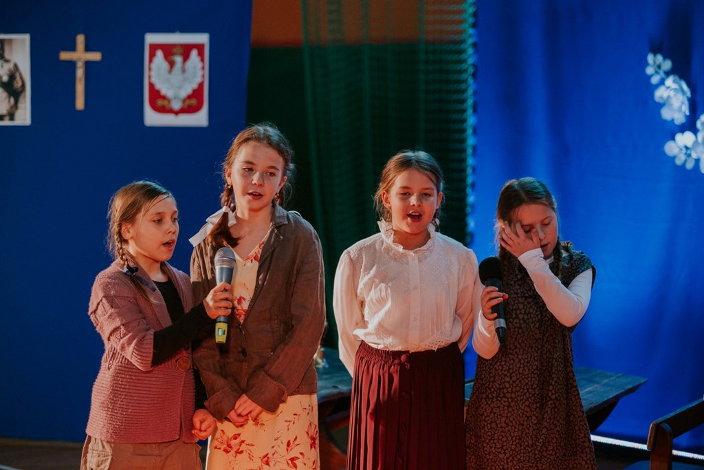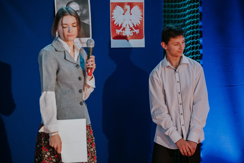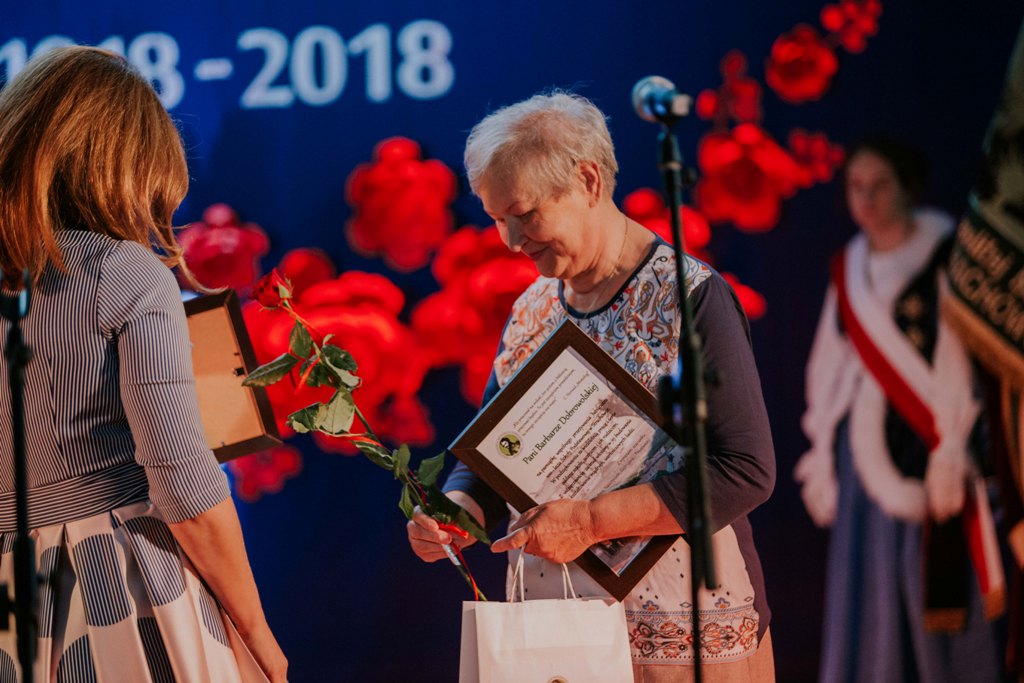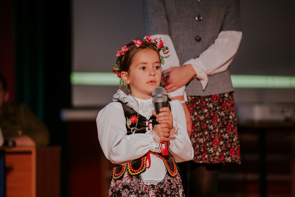 Kolejnym punktem uroczystości była prezentacja dziejów szkoły zrobiona na różne sposoby. Alicja Bujalska piosenką „Gdzie dziewczęta z tamtych lat” wyczarowała klimat przedwojennej Polski. Na prezentacji zgromadzeni zobaczyli karty z kroniki, zdjęcia, a dzieci w pierwszej scence teatralnej pokazały naukę kaligrafii. Konferansjerzy prowadzili nas przez kolejne okresy stuletniej historii szkoły. Nie zabrakło filmów z wywiadami, zakazanych piosenek, krakowiaka w wykonania pierwszaków, lekcji biologii i wierszy Cypriana Norwida, wzruszających piosenek „Twarze, twarze”, czy „Lubię wracać tam, gdzie byłem już” śpiewanych przez Ewelinę Cudną naszą absolwentkę. Końcowym akordem części artystycznej był przepiękny walc w wykonaniu uczniów z klasy VIII i III gimnazjum.