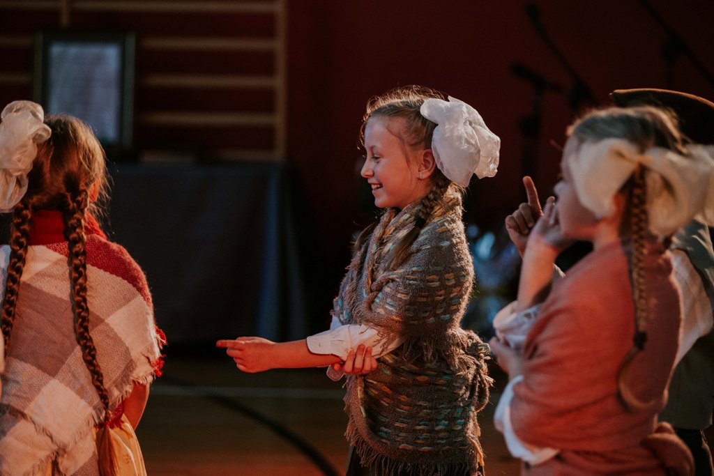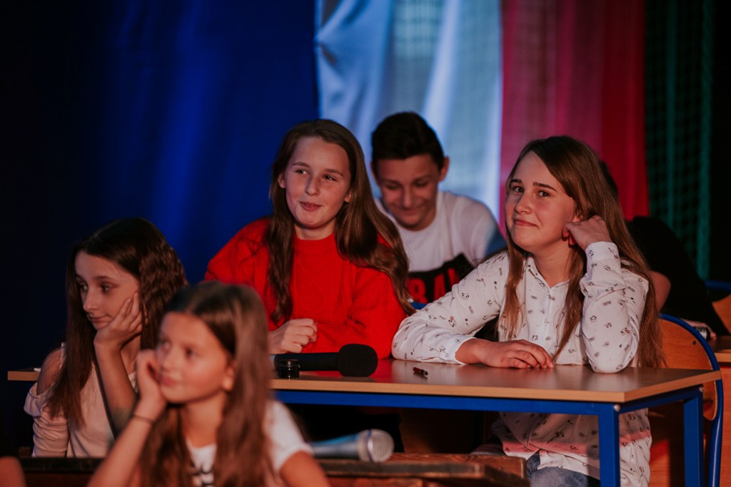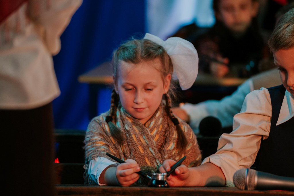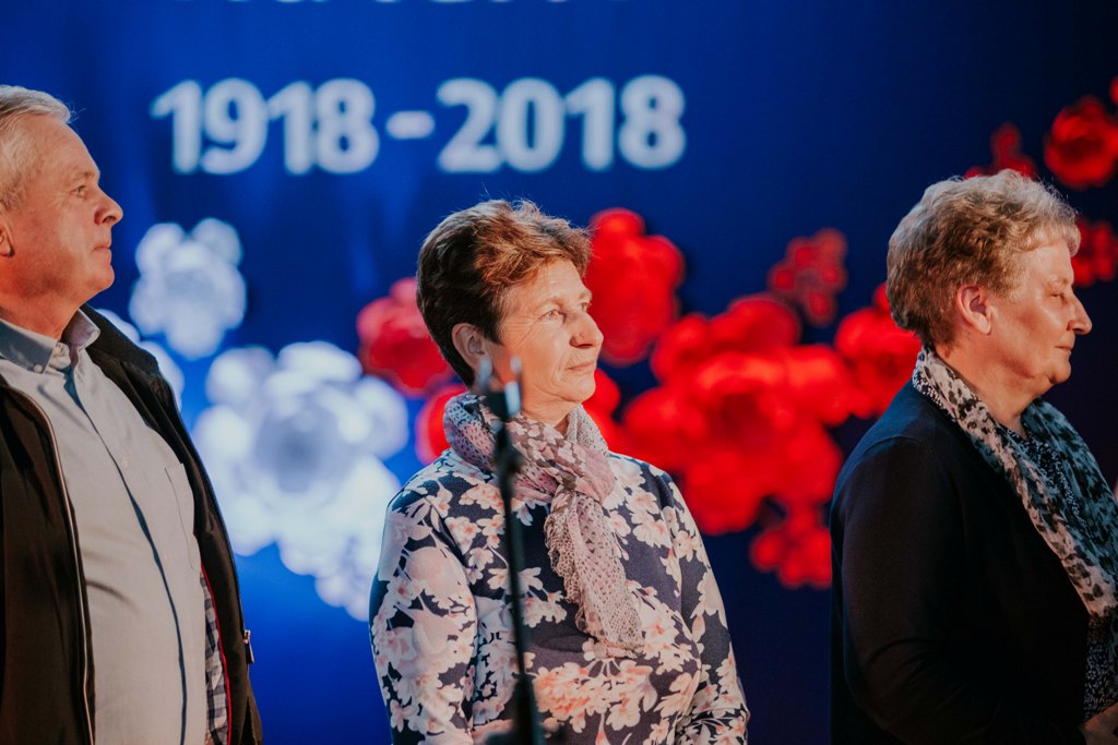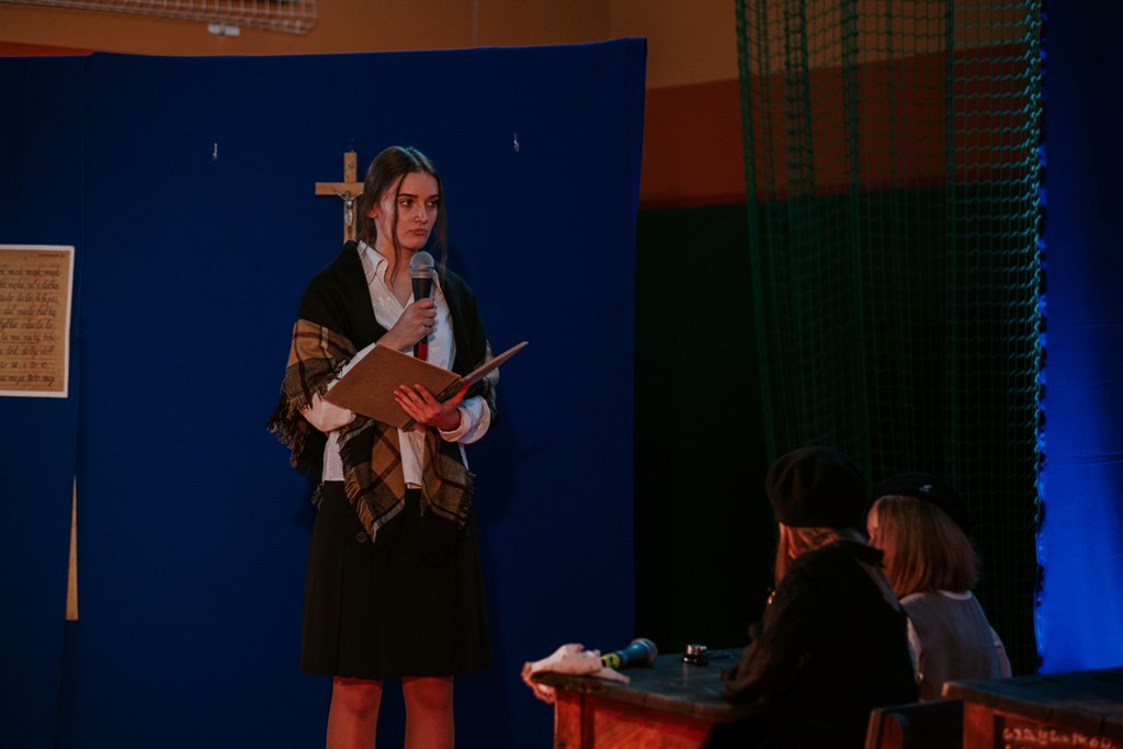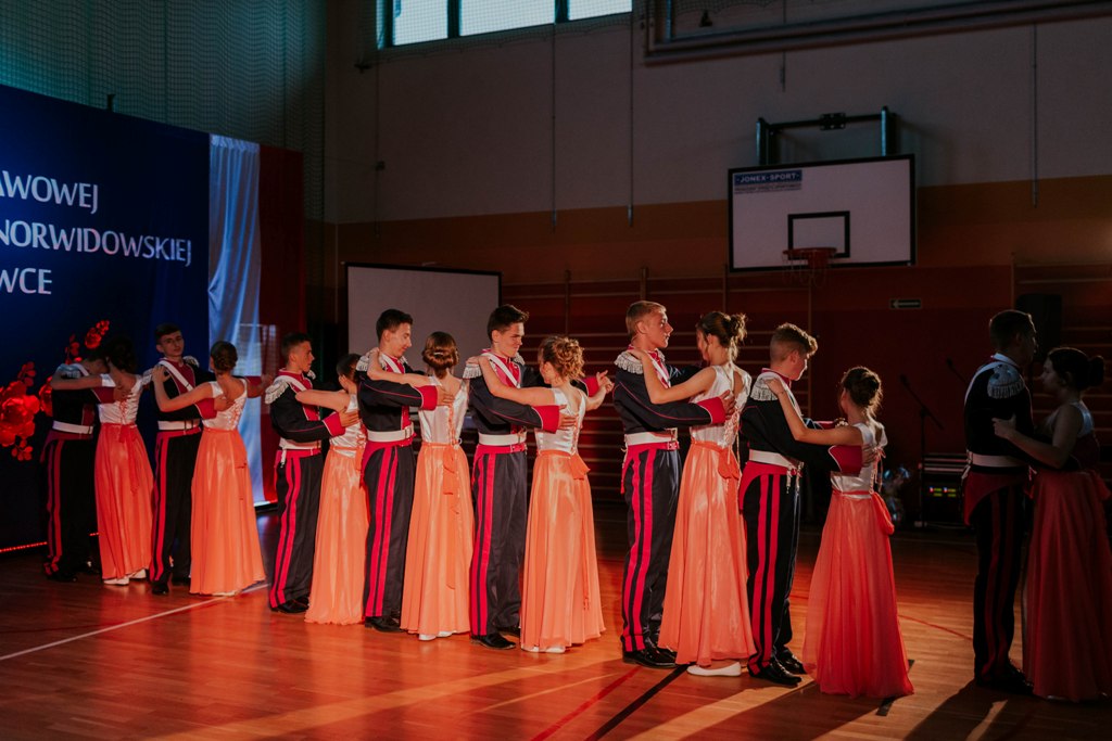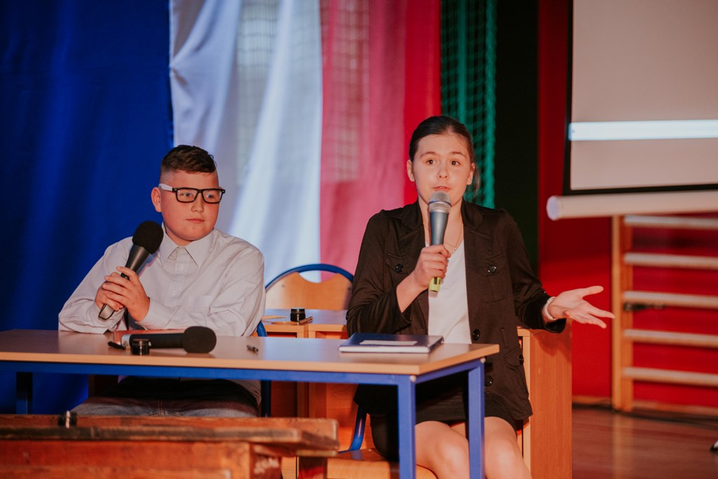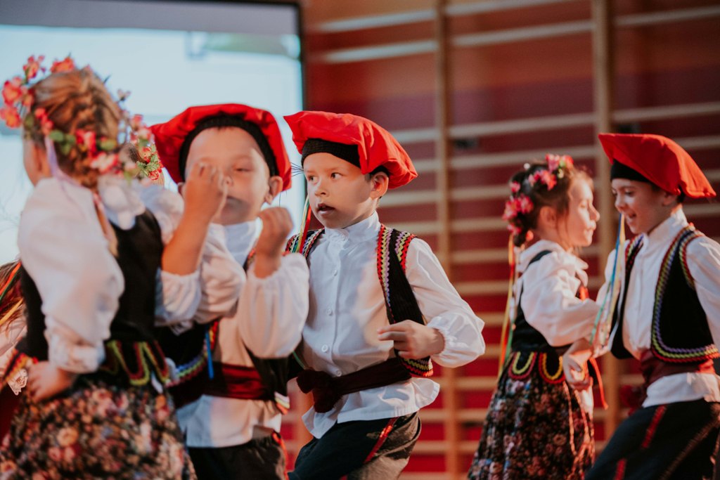 Kolejnym punktem uroczystości była prezentacja dziejów szkoły zrobiona na różne sposoby. Alicja Bujalska piosenką „Gdzie dziewczęta z tamtych lat” wyczarowała klimat przedwojennej Polski. Na prezentacji zgromadzeni zobaczyli karty z kroniki, zdjęcia, a dzieci w pierwszej scence teatralnej pokazały naukę kaligrafii. Konferansjerzy prowadzili nas przez kolejne okresy stuletniej historii szkoły. Nie zabrakło filmów z wywiadami, zakazanych piosenek, krakowiaka w wykonania pierwszaków, lekcji biologii i wierszy Cypriana Norwida, wzruszających piosenek „Twarze, twarze”, czy „Lubię wracać tam, gdzie byłem już” śpiewanych przez Ewelinę Cudną naszą absolwentkę. Końcowym akordem części artystycznej był przepiękny walc w wykonaniu uczniów z klasy VIII i III gimnazjum.