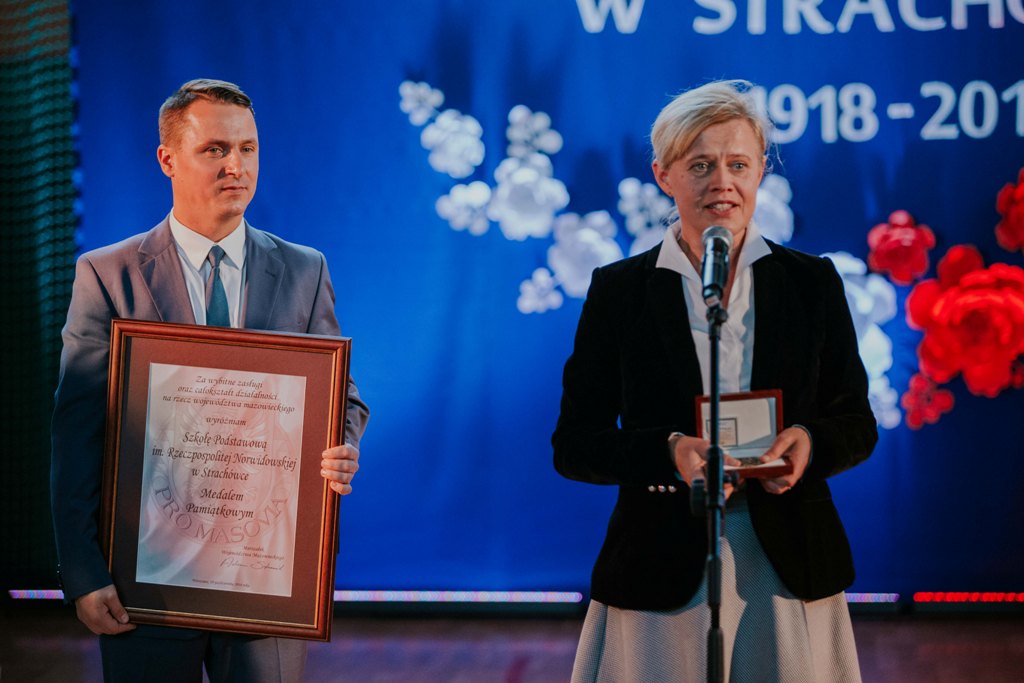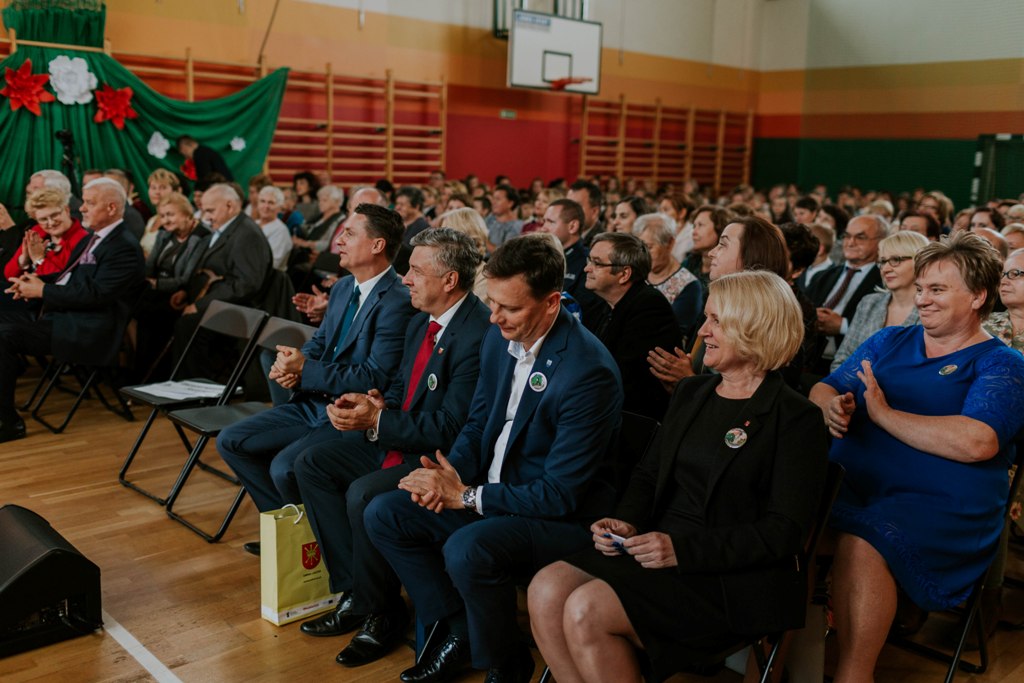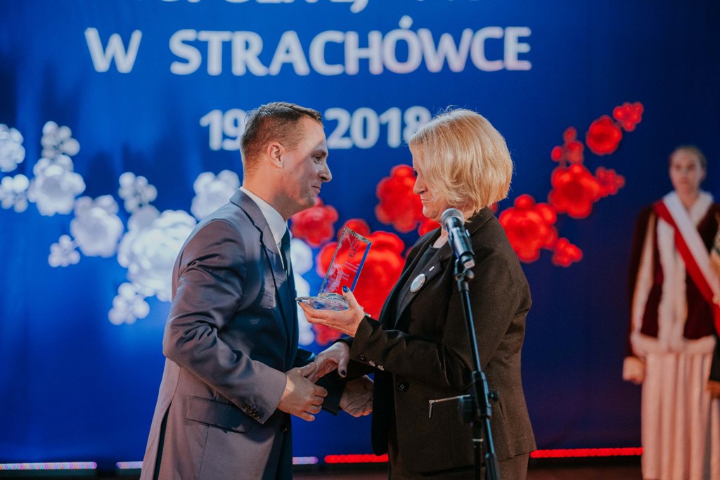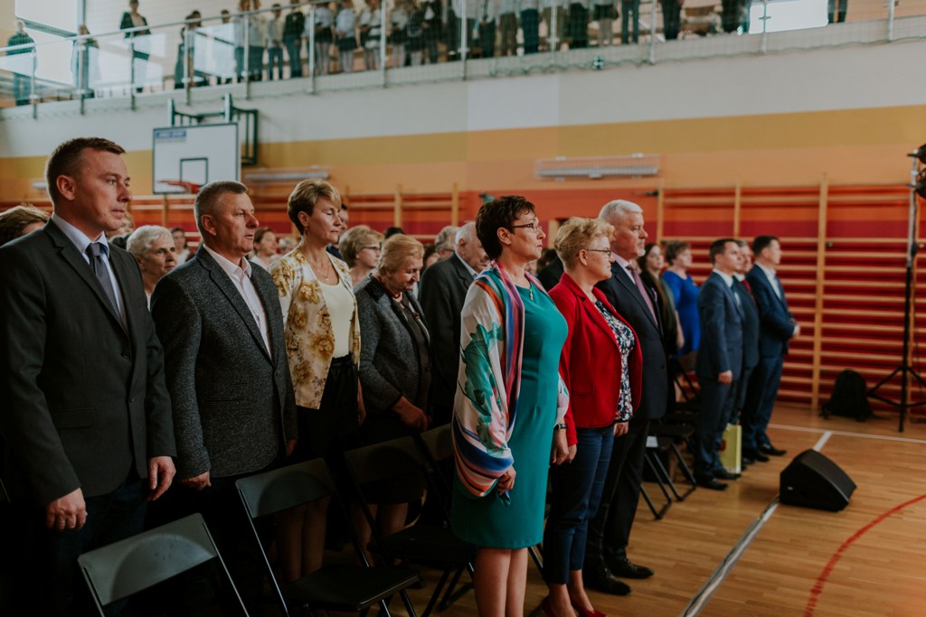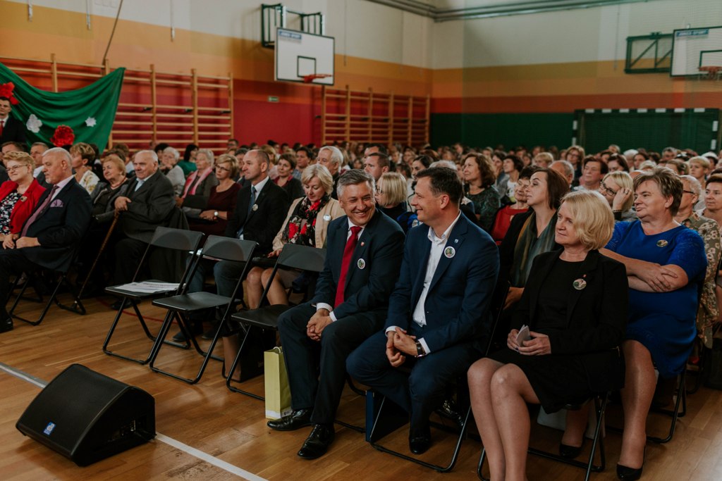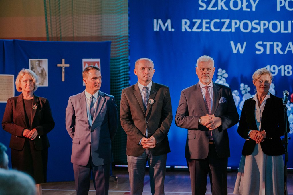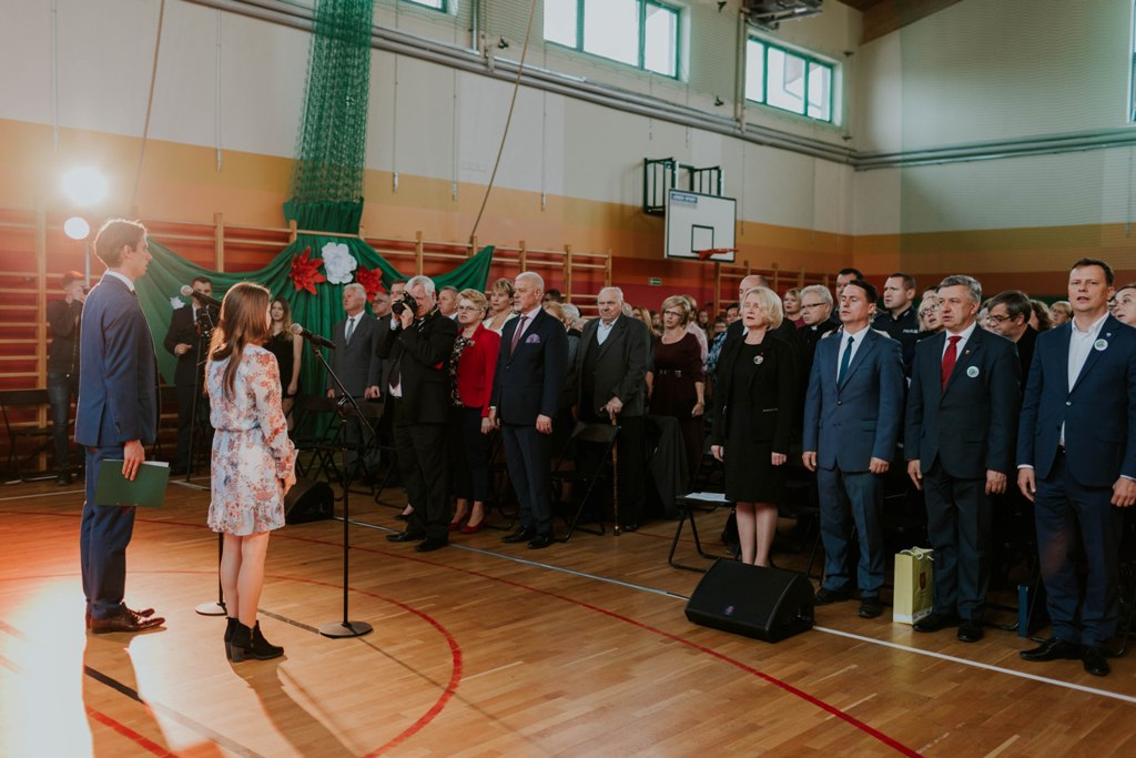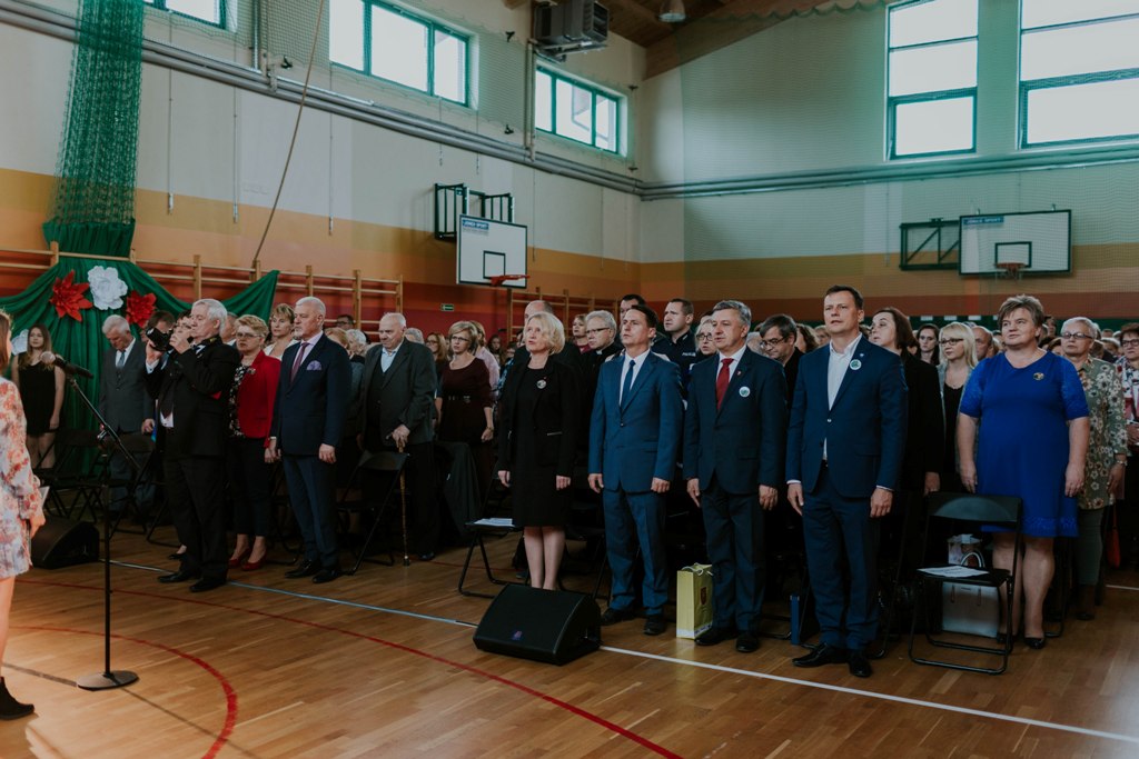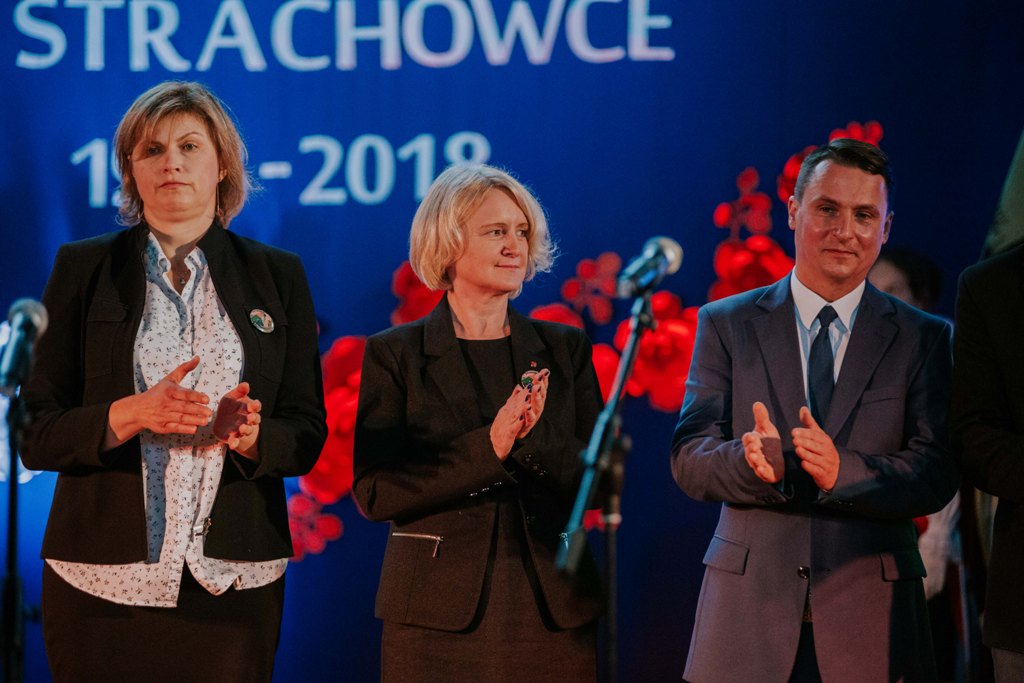 Młodzież klasy VIII szkoły podstawowej i III gimnazjum przywitała gości staropolskim polonezem, po czym uroczystość poprowadzili nasi absolwenci Alicja Bujalska i Łazarz Kapaon. Po krótkim wprowadzeniu oddali głos dyrektorowi szkoły pani Grażynie Kapaon. Pani Dyrektor ze wzruszeniem witała: najstarszego ucznia naszej szkoły Wacława Zbrzeźniaka, byłych dyrektorów i nauczycieli emerytów, przedstawiciela Marszałka Województwa Mazowieckiego Adama Struzika p. Bożenę Żelazowską, starostę powiatu wołomińskiego Kazimierza Rakowskiego, wójta Piotra Orzechowskiego, wójta gminy Jadów Dariusza Kokoszkę, burmistrza Tłuszcza Pawła Bednarczyka, Henrykę Michalczewską z wydziału promocji starostwa powiatu wołomińskiego, prezesa ZNP w Wołominie p. Katarzynę Kadzidłowską, przedstawiciela NSZZ „Solidarność” komisji w Łochowie Beatę Kotarbę, radną powiatową Magdalenę Suchenek, przewodniczącą rady gminy Annę Ołdak, Magdalenę Jurewicz przedstawicielkę Szkoły Edukacji Polsko - Amerykańskiej Fundacji Wolności i Uniwersytetu Warszawskiego, przedstawiciela komisariatu Policji w Jadowie, kierownika GOPS p. Krystynę Radzio, kierownika biblioteki gminnej Annę Gołoś, dyrektora SZOEASz p. Henryka Szczęsnego, księży, dyrektorów szkół, Koła Gospodyń Wiejskich z Jadwisina, Równego, Strachówki, druhów z OSP, rodziców i uczniów, mieszkańców gminy Strachówka. W pięknych słowach przemówienia nakreśliła ideały i wartości, które przyświecają naszej codziennej pracy, swoiste credo szkoły. Pani Dyrektor w swoim przemówieniu związała świętowanie szkoły, ze świętowaniem narodu i państwa w stulecie odzyskania niepodległości. Podkreśliła w ten sposób, że głębi uroczystościom dodaje dramatyczna historia ostatnich stu lat. Nazwała po imieniu zmienne losy wolności i niepodległości na naszej ziemi: II RP, II Wojnę Światową i hitleryzm, PRL i komunizm, Solidarność, stan wojenny i czas pełnej wolności od 29 lat. W tych wszystkich okolicznościach działała szkoła. Dzisiaj jest wśród liderów polskiej oświaty i szkolnictwa. Należy do elitarnych kilku procent, które podjęły świadomie pracę nad swoją dydaktyką i wychowaniem według najnowocześniejszych programów.