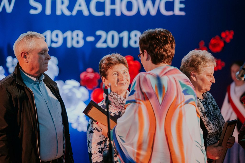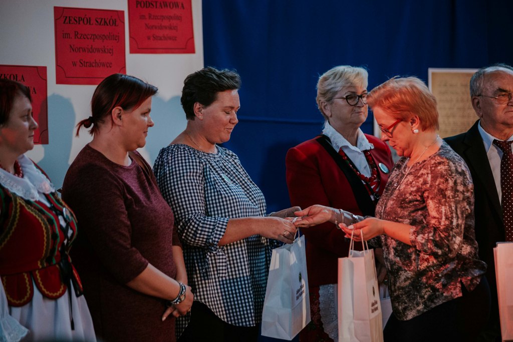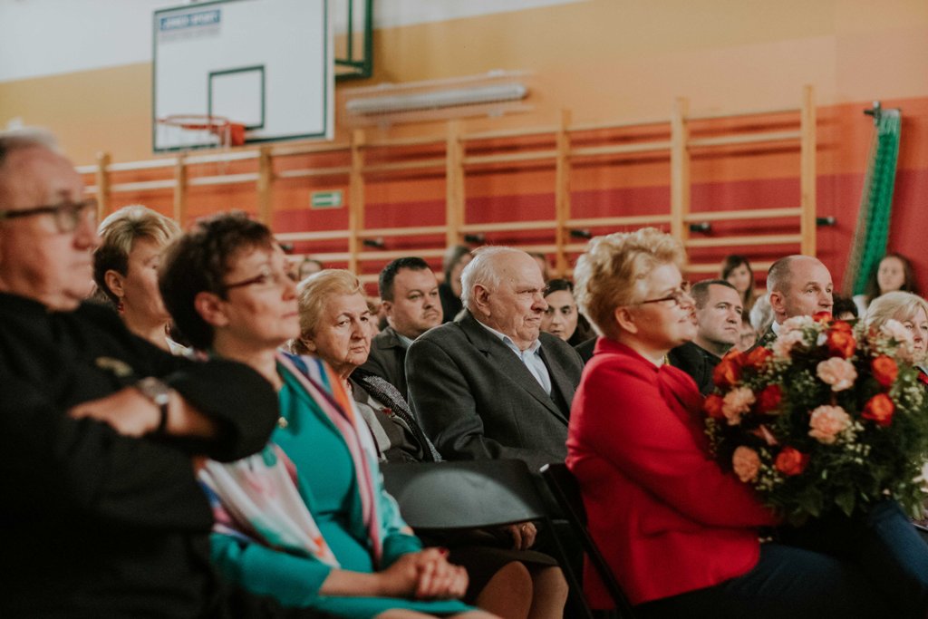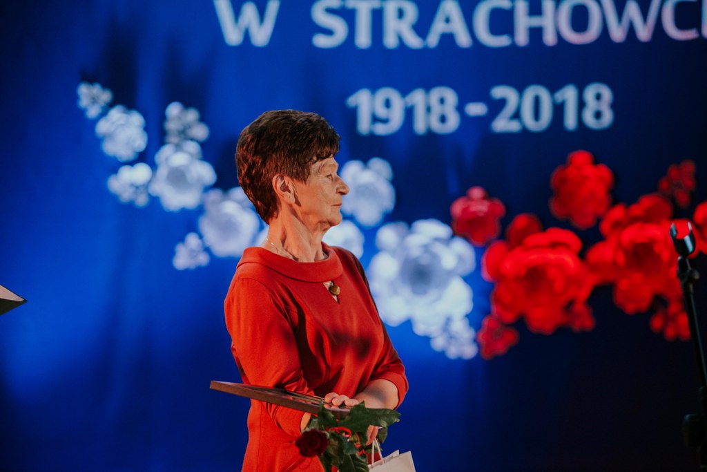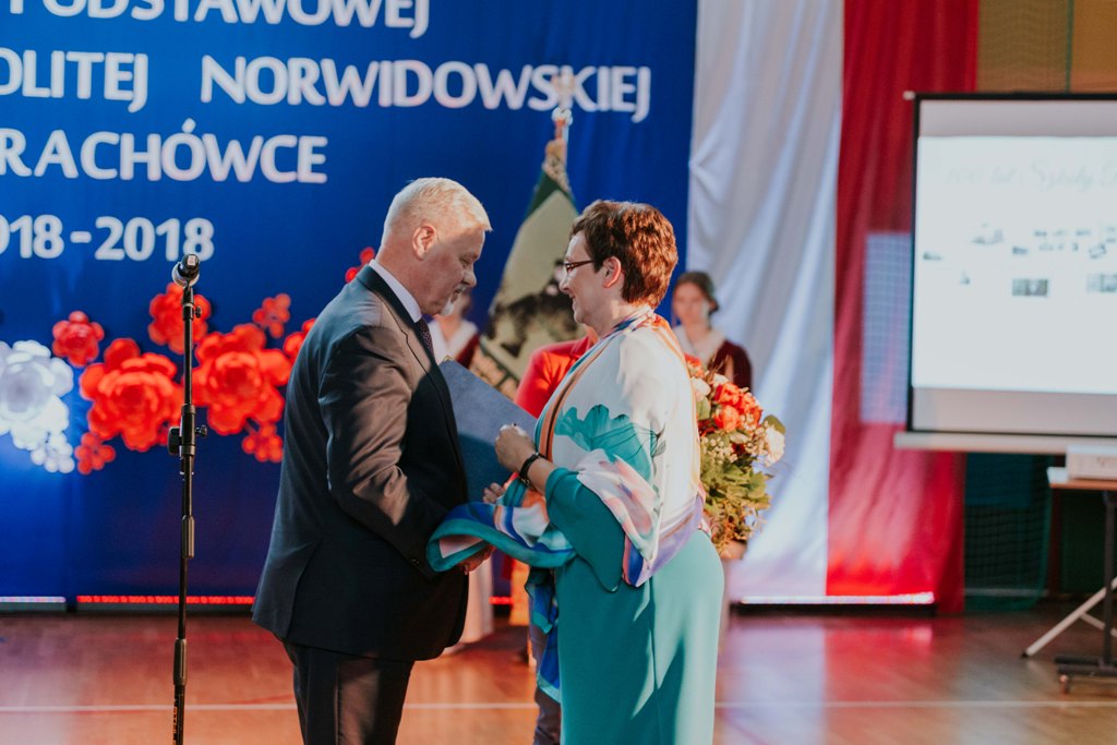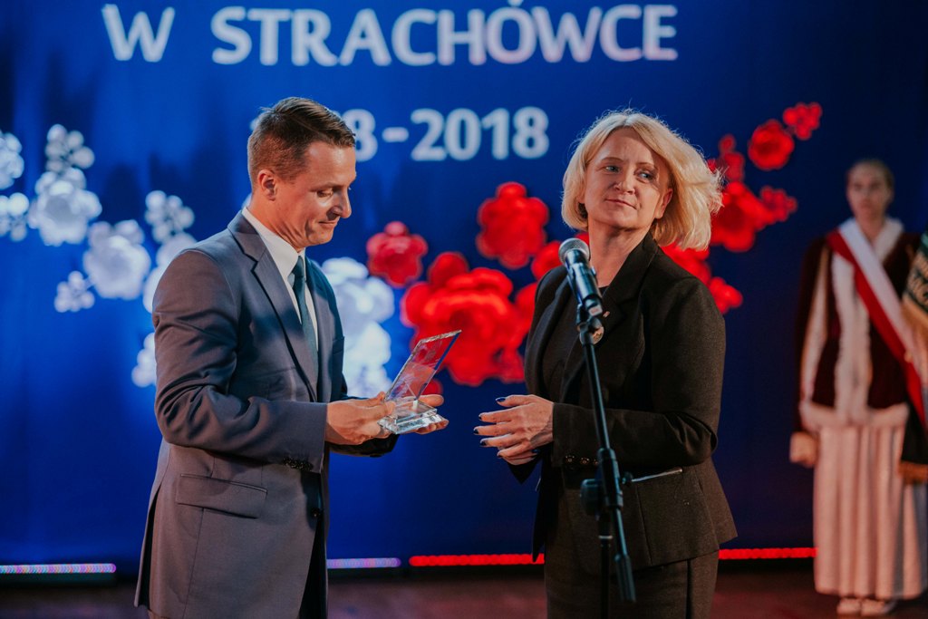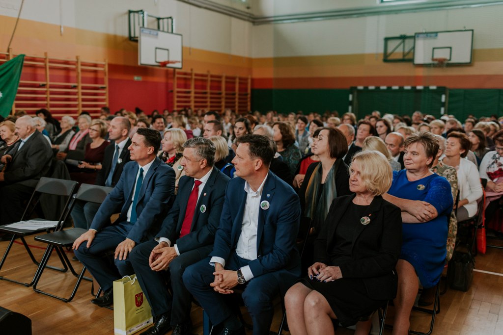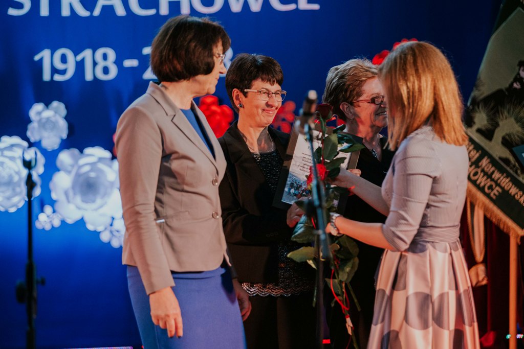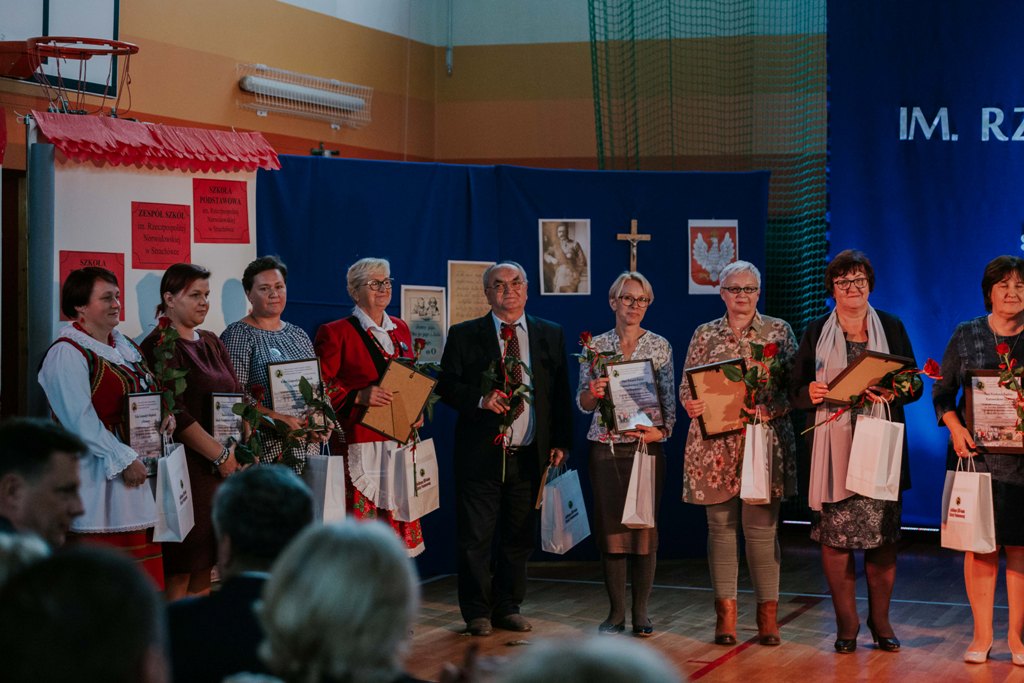 Młodzież klasy VIII szkoły podstawowej i III gimnazjum przywitała gości staropolskim polonezem, po czym uroczystość poprowadzili nasi absolwenci Alicja Bujalska i Łazarz Kapaon. Po krótkim wprowadzeniu oddali głos dyrektorowi szkoły pani Grażynie Kapaon. Pani Dyrektor ze wzruszeniem witała: najstarszego ucznia naszej szkoły Wacława Zbrzeźniaka, byłych dyrektorów i nauczycieli emerytów, przedstawiciela Marszałka Województwa Mazowieckiego Adama Struzika p. Bożenę Żelazowską, starostę powiatu wołomińskiego Kazimierza Rakowskiego, wójta Piotra Orzechowskiego, wójta gminy Jadów Dariusza Kokoszkę, burmistrza Tłuszcza Pawła Bednarczyka, Henrykę Michalczewską z wydziału promocji starostwa powiatu wołomińskiego, prezesa ZNP w Wołominie p. Katarzynę Kadzidłowską, przedstawiciela NSZZ „Solidarność” komisji w Łochowie Beatę Kotarbę, radną powiatową Magdalenę Suchenek, przewodniczącą rady gminy Annę Ołdak, Magdalenę Jurewicz przedstawicielkę Szkoły Edukacji Polsko - Amerykańskiej Fundacji Wolności i Uniwersytetu Warszawskiego, przedstawiciela komisariatu Policji w Jadowie, kierownika GOPS p. Krystynę Radzio, kierownika biblioteki gminnej Annę Gołoś, dyrektora SZOEASz p. Henryka Szczęsnego, księży, dyrektorów szkół, Koła Gospodyń Wiejskich z Jadwisina, Równego, Strachówki, druhów z OSP, rodziców i uczniów, mieszkańców gminy Strachówka. W pięknych słowach przemówienia nakreśliła ideały i wartości, które przyświecają naszej codziennej pracy, swoiste credo szkoły. Pani Dyrektor w swoim przemówieniu związała świętowanie szkoły, ze świętowaniem narodu i państwa w stulecie odzyskania niepodległości. Podkreśliła w ten sposób, że głębi uroczystościom dodaje dramatyczna historia ostatnich stu lat. Nazwała po imieniu zmienne losy wolności i niepodległości na naszej ziemi: II RP, II Wojnę Światową i hitleryzm, PRL i komunizm, Solidarność, stan wojenny i czas pełnej wolności od 29 lat. W tych wszystkich okolicznościach działała szkoła. Dzisiaj jest wśród liderów polskiej oświaty i szkolnictwa. Należy do elitarnych kilku procent, które podjęły świadomie pracę nad swoją dydaktyką i wychowaniem według najnowocześniejszych programów.
