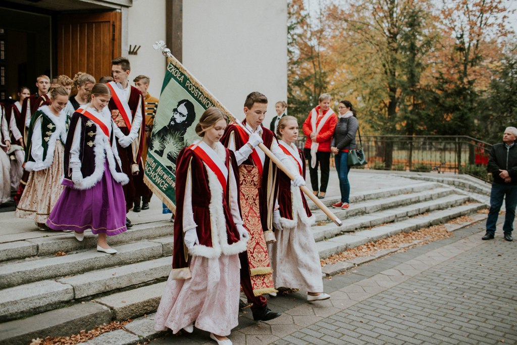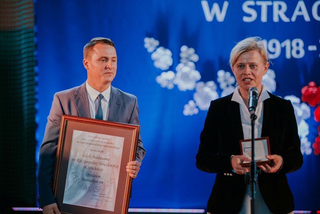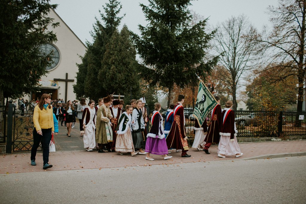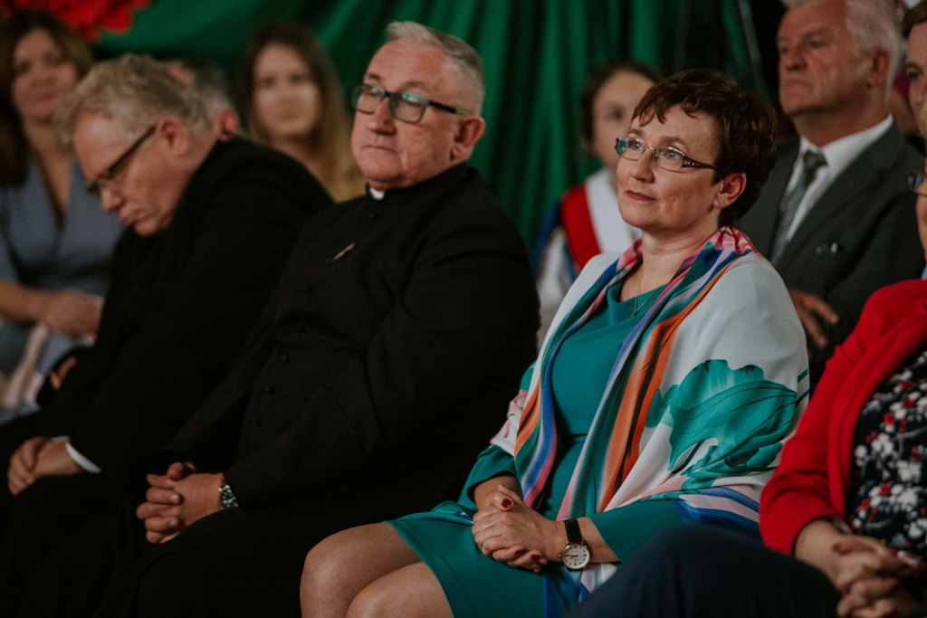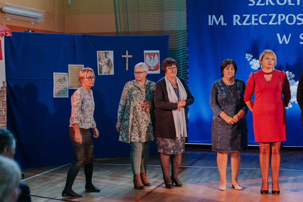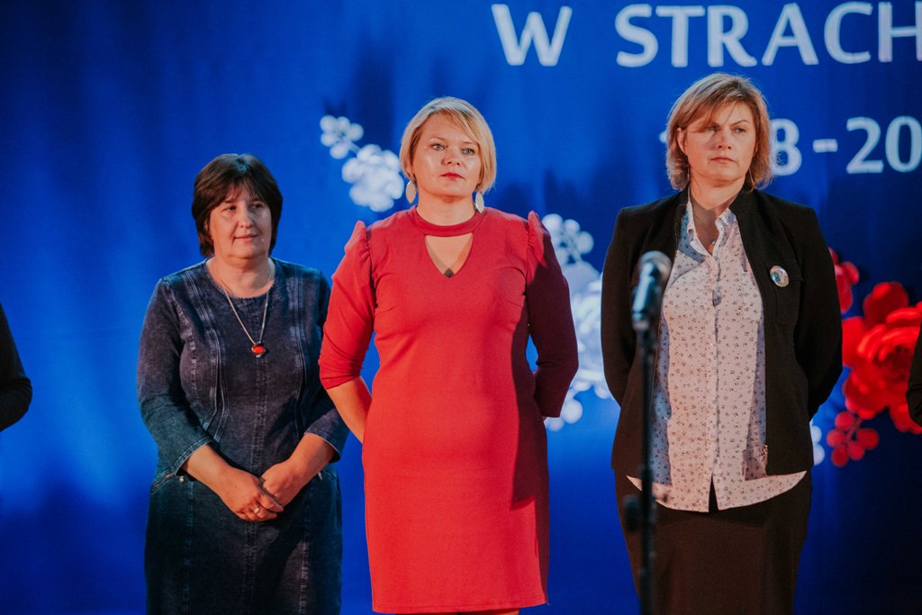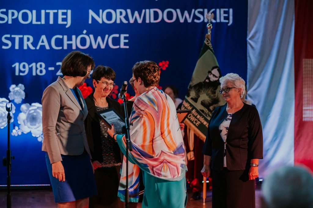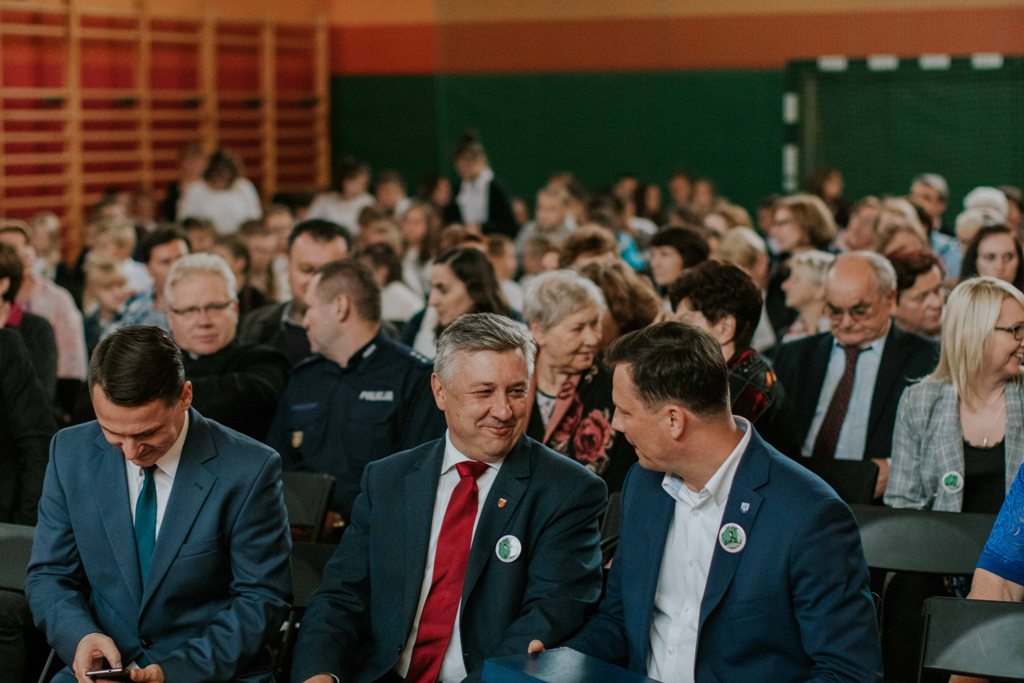Młodzież klasy VIII szkoły podstawowej i III gimnazjum przywitała gości staropolskim polonezem, po czym uroczystość poprowadzili nasi absolwenci Alicja Bujalska i Łazarz Kapaon. Po krótkim wprowadzeniu oddali głos dyrektorowi szkoły pani Grażynie Kapaon. Pani Dyrektor ze wzruszeniem witała: najstarszego ucznia naszej szkoły Wacława Zbrzeźniaka, byłych dyrektorów i nauczycieli emerytów, przedstawiciela Marszałka Województwa Mazowieckiego Adama Struzika p. Bożenę Żelazowską, starostę powiatu wołomińskiego Kazimierza Rakowskiego, wójta Piotra Orzechowskiego, wójta gminy Jadów Dariusza Kokoszkę, burmistrza Tłuszcza Pawła Bednarczyka, Henrykę Michalczewską z wydziału promocji starostwa powiatu wołomińskiego, prezesa ZNP w Wołominie p. Katarzynę Kadzidłowską, przedstawiciela NSZZ „Solidarność” komisji w Łochowie Beatę Kotarbę, radną powiatową Magdalenę Suchenek, przewodniczącą rady gminy Annę Ołdak, Magdalenę Jurewicz przedstawicielkę Szkoły Edukacji Polsko - Amerykańskiej Fundacji Wolności i Uniwersytetu Warszawskiego, przedstawiciela komisariatu Policji w Jadowie, kierownika GOPS p. Krystynę Radzio, kierownika biblioteki gminnej Annę Gołoś, dyrektora SZOEASz p. Henryka Szczęsnego, księży, dyrektorów szkół, Koła Gospodyń Wiejskich z Jadwisina, Równego, Strachówki, druhów z OSP, rodziców i uczniów, mieszkańców gminy Strachówka. W pięknych słowach przemówienia nakreśliła ideały i wartości, które przyświecają naszej codziennej pracy, swoiste credo szkoły. Pani Dyrektor w swoim przemówieniu związała świętowanie szkoły, ze świętowaniem narodu i państwa w stulecie odzyskania niepodległości. Podkreśliła w ten sposób, że głębi uroczystościom dodaje dramatyczna historia ostatnich stu lat. Nazwała po imieniu zmienne losy wolności i niepodległości na naszej ziemi: II RP, II Wojnę Światową i hitleryzm, PRL i komunizm, Solidarność, stan wojenny i czas pełnej wolności od 29 lat. W tych wszystkich okolicznościach działała szkoła. Dzisiaj jest wśród liderów polskiej oświaty i szkolnictwa. Należy do elitarnych kilku procent, które podjęły świadomie pracę nad swoją dydaktyką i wychowaniem według najnowocześniejszych programów.