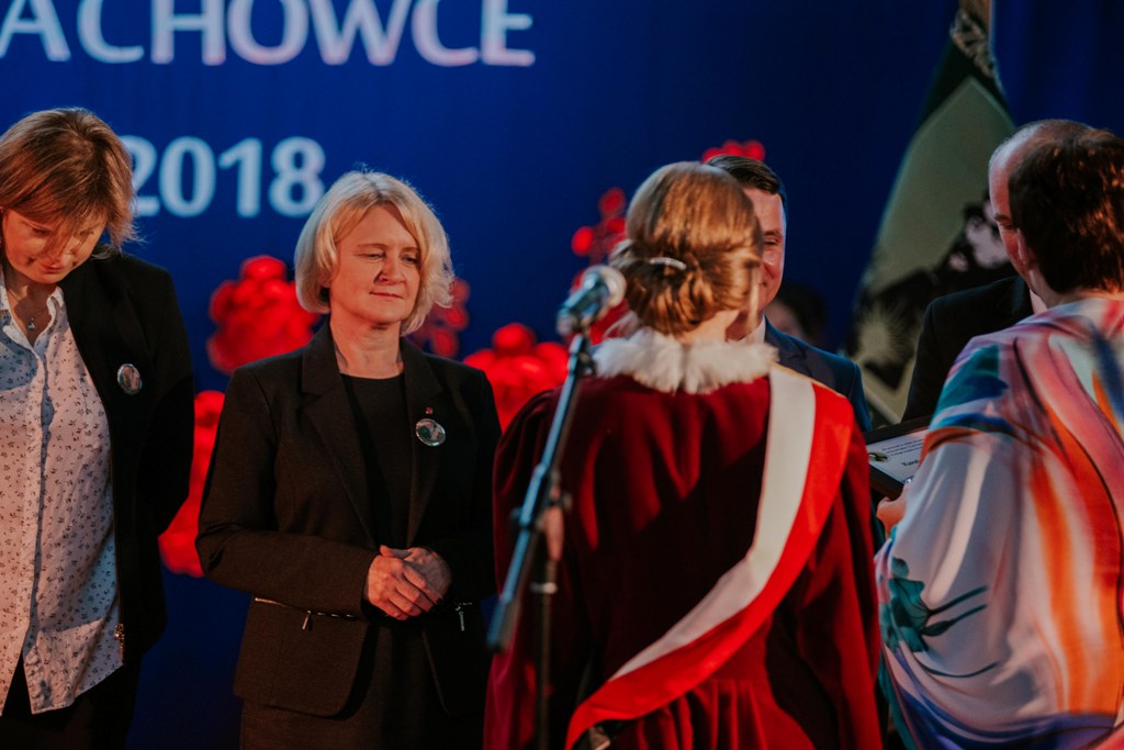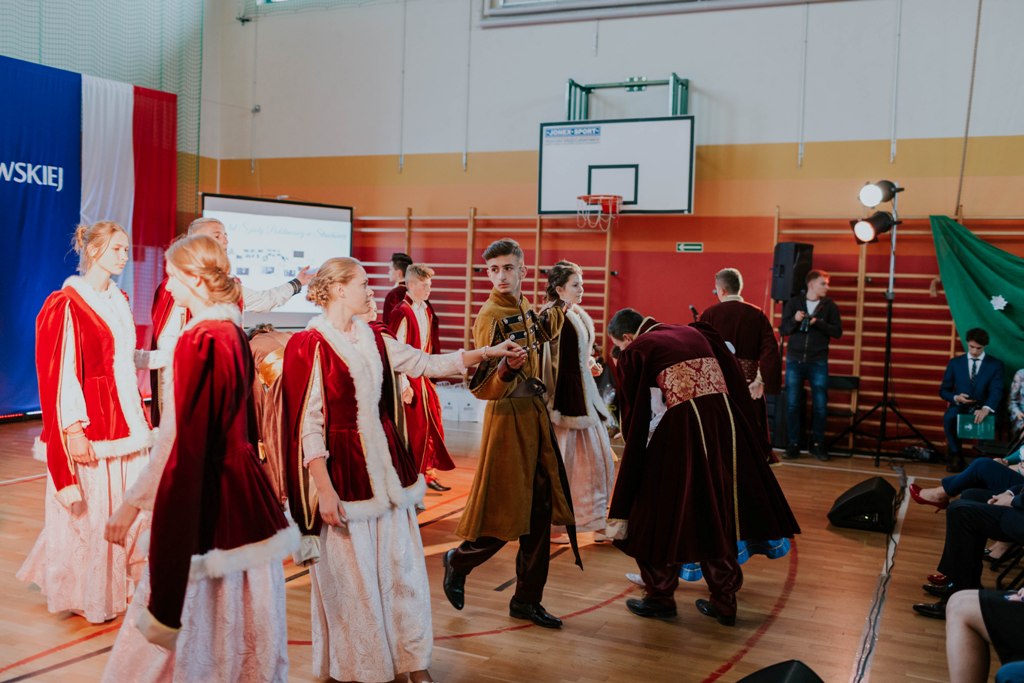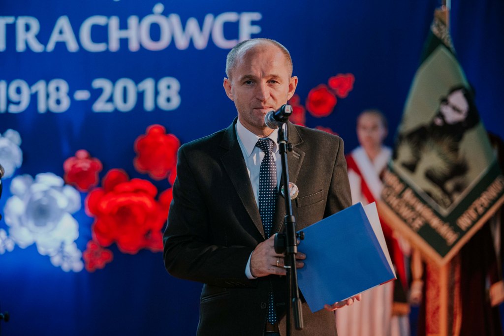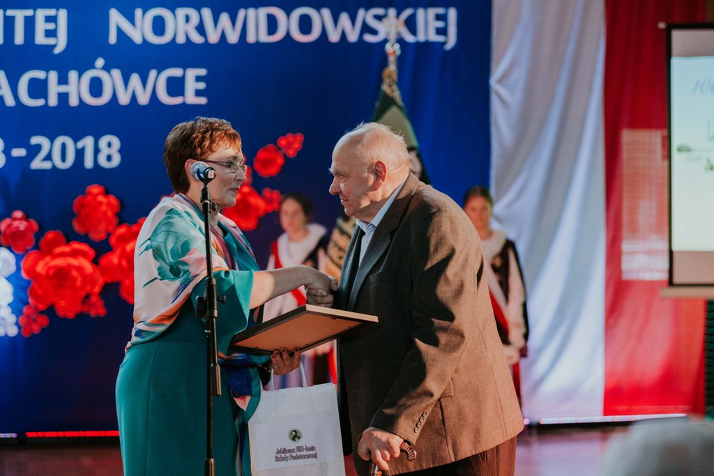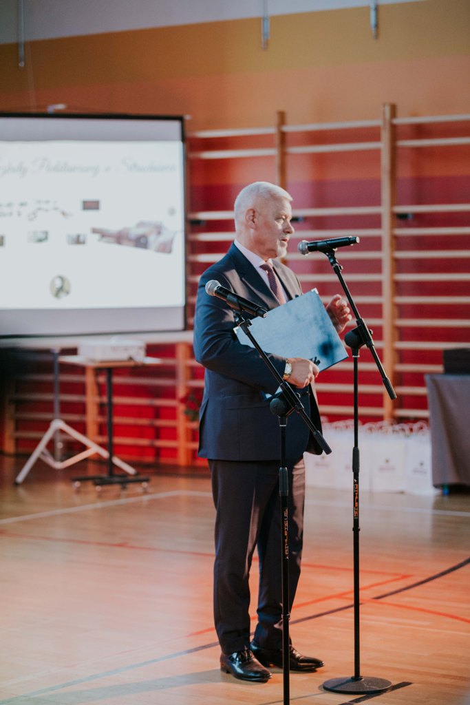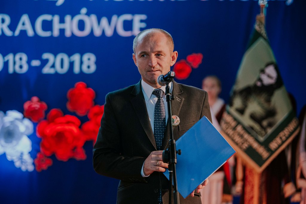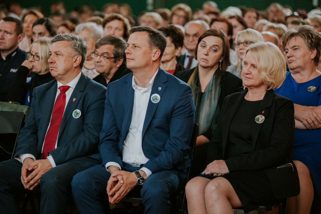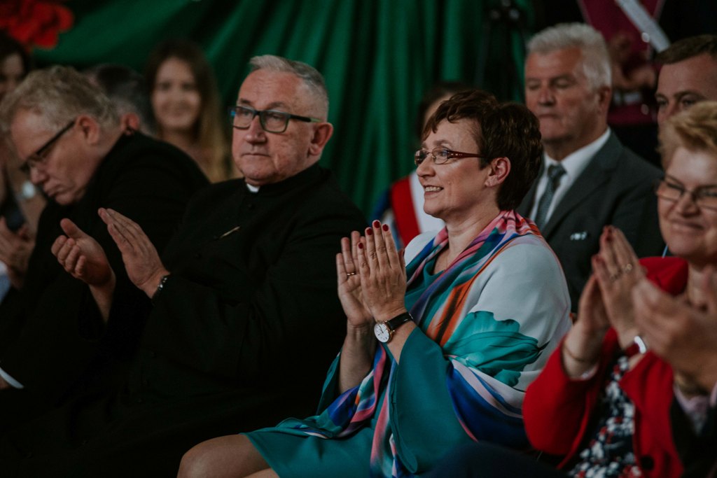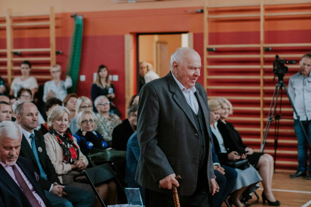 Młodzież klasy VIII szkoły podstawowej i III gimnazjum przywitała gości staropolskim polonezem, po czym uroczystość poprowadzili nasi absolwenci Alicja Bujalska i Łazarz Kapaon. Po krótkim wprowadzeniu oddali głos dyrektorowi szkoły pani Grażynie Kapaon. Pani Dyrektor ze wzruszeniem witała: najstarszego ucznia naszej szkoły Wacława Zbrzeźniaka, byłych dyrektorów i nauczycieli emerytów, przedstawiciela Marszałka Województwa Mazowieckiego Adama Struzika p. Bożenę Żelazowską, starostę powiatu wołomińskiego Kazimierza Rakowskiego, wójta Piotra Orzechowskiego, wójta gminy Jadów Dariusza Kokoszkę, burmistrza Tłuszcza Pawła Bednarczyka, Henrykę Michalczewską z wydziału promocji starostwa powiatu wołomińskiego, prezesa ZNP w Wołominie p. Katarzynę Kadzidłowską, przedstawiciela NSZZ „Solidarność” komisji w Łochowie Beatę Kotarbę, radną powiatową Magdalenę Suchenek, przewodniczącą rady gminy Annę Ołdak, Magdalenę Jurewicz przedstawicielkę Szkoły Edukacji Polsko - Amerykańskiej Fundacji Wolności i Uniwersytetu Warszawskiego, przedstawiciela komisariatu Policji w Jadowie, kierownika GOPS p. Krystynę Radzio, kierownika biblioteki gminnej Annę Gołoś, dyrektora SZOEASz p. Henryka Szczęsnego, księży, dyrektorów szkół, Koła Gospodyń Wiejskich z Jadwisina, Równego, Strachówki, druhów z OSP, rodziców i uczniów, mieszkańców gminy Strachówka. W pięknych słowach przemówienia nakreśliła ideały i wartości, które przyświecają naszej codziennej pracy, swoiste credo szkoły. Pani Dyrektor w swoim przemówieniu związała świętowanie szkoły, ze świętowaniem narodu i państwa w stulecie odzyskania niepodległości. Podkreśliła w ten sposób, że głębi uroczystościom dodaje dramatyczna historia ostatnich stu lat. Nazwała po imieniu zmienne losy wolności i niepodległości na naszej ziemi: II RP, II Wojnę Światową i hitleryzm, PRL i komunizm, Solidarność, stan wojenny i czas pełnej wolności od 29 lat. W tych wszystkich okolicznościach działała szkoła. Dzisiaj jest wśród liderów polskiej oświaty i szkolnictwa. Należy do elitarnych kilku procent, które podjęły świadomie pracę nad swoją dydaktyką i wychowaniem według najnowocześniejszych programów.