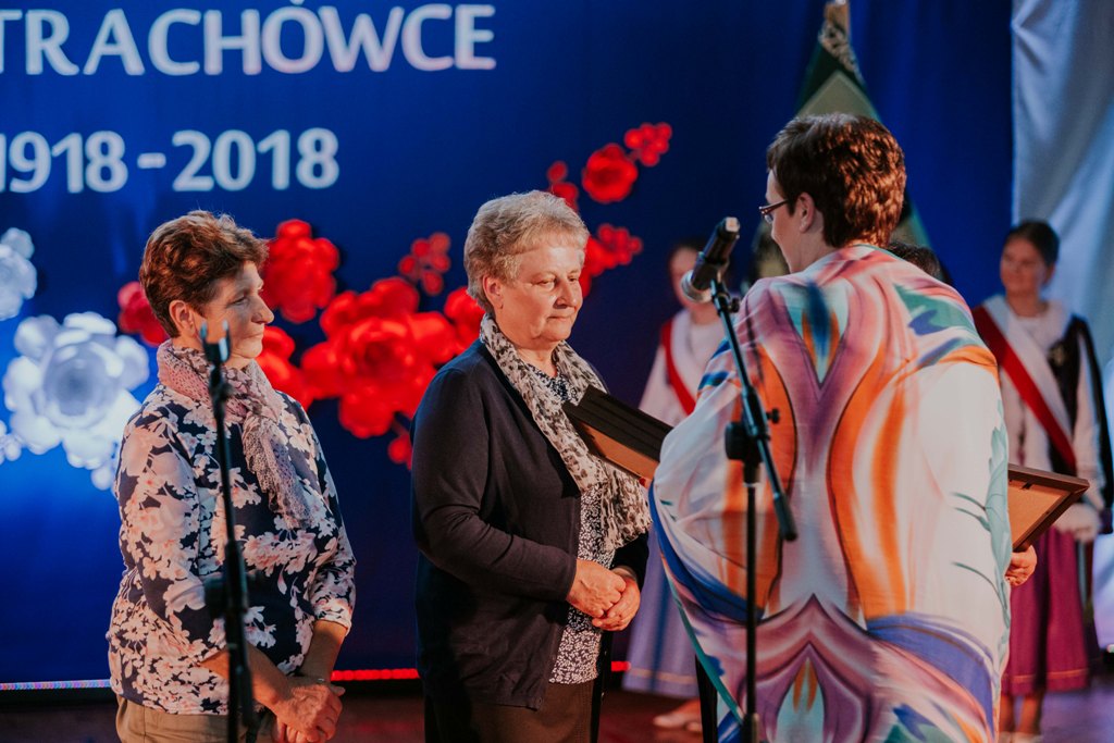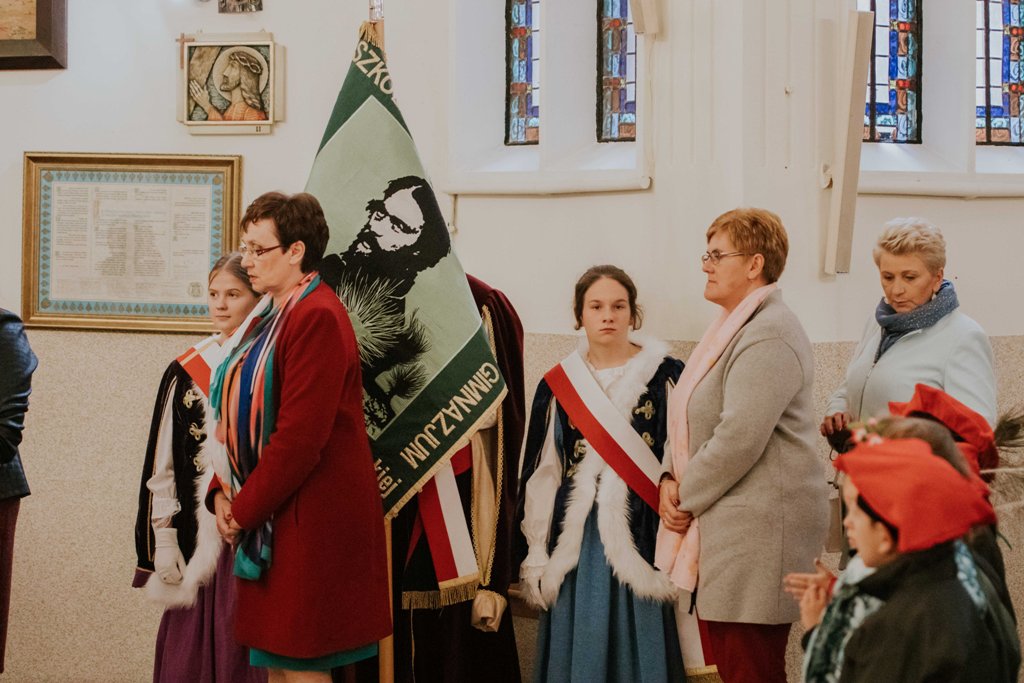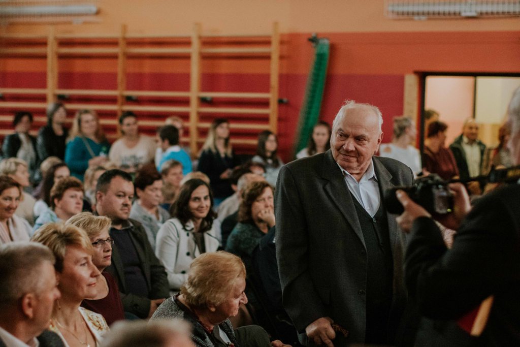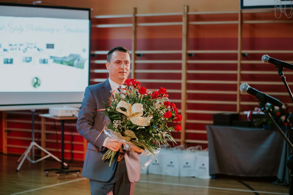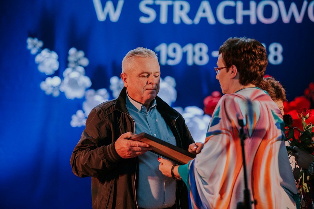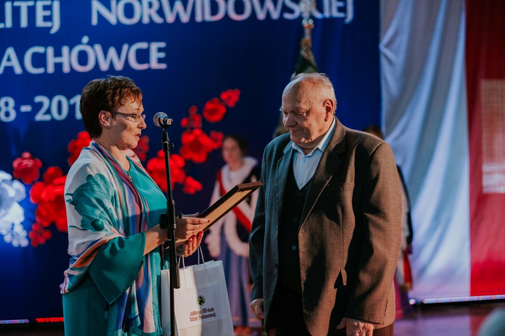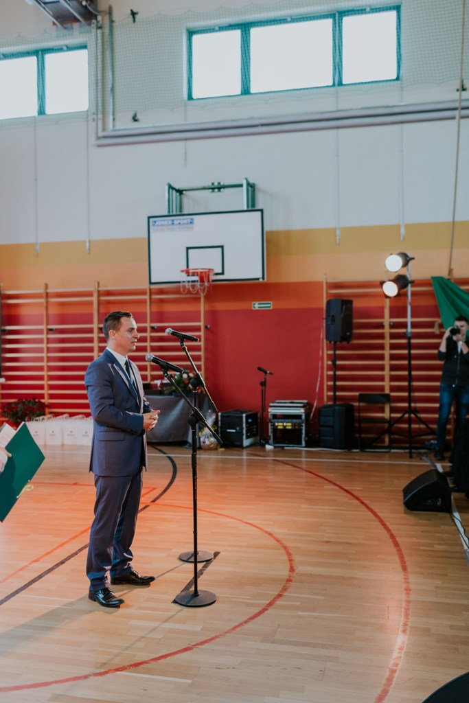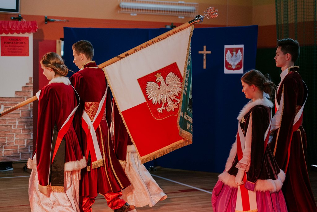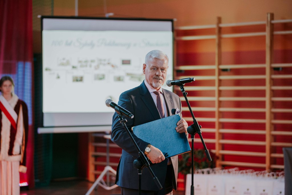 Młodzież klasy VIII szkoły podstawowej i III gimnazjum przywitała gości staropolskim polonezem, po czym uroczystość poprowadzili nasi absolwenci Alicja Bujalska i Łazarz Kapaon. Po krótkim wprowadzeniu oddali głos dyrektorowi szkoły pani Grażynie Kapaon. Pani Dyrektor ze wzruszeniem witała: najstarszego ucznia naszej szkoły Wacława Zbrzeźniaka, byłych dyrektorów i nauczycieli emerytów, przedstawiciela Marszałka Województwa Mazowieckiego Adama Struzika p. Bożenę Żelazowską, starostę powiatu wołomińskiego Kazimierza Rakowskiego, wójta Piotra Orzechowskiego, wójta gminy Jadów Dariusza Kokoszkę, burmistrza Tłuszcza Pawła Bednarczyka, Henrykę Michalczewską z wydziału promocji starostwa powiatu wołomińskiego, prezesa ZNP w Wołominie p. Katarzynę Kadzidłowską, przedstawiciela NSZZ „Solidarność” komisji w Łochowie Beatę Kotarbę, radną powiatową Magdalenę Suchenek, przewodniczącą rady gminy Annę Ołdak, Magdalenę Jurewicz przedstawicielkę Szkoły Edukacji Polsko - Amerykańskiej Fundacji Wolności i Uniwersytetu Warszawskiego, przedstawiciela komisariatu Policji w Jadowie, kierownika GOPS p. Krystynę Radzio, kierownika biblioteki gminnej Annę Gołoś, dyrektora SZOEASz p. Henryka Szczęsnego, księży, dyrektorów szkół, Koła Gospodyń Wiejskich z Jadwisina, Równego, Strachówki, druhów z OSP, rodziców i uczniów, mieszkańców gminy Strachówka. W pięknych słowach przemówienia nakreśliła ideały i wartości, które przyświecają naszej codziennej pracy, swoiste credo szkoły. Pani Dyrektor w swoim przemówieniu związała świętowanie szkoły, ze świętowaniem narodu i państwa w stulecie odzyskania niepodległości. Podkreśliła w ten sposób, że głębi uroczystościom dodaje dramatyczna historia ostatnich stu lat. Nazwała po imieniu zmienne losy wolności i niepodległości na naszej ziemi: II RP, II Wojnę Światową i hitleryzm, PRL i komunizm, Solidarność, stan wojenny i czas pełnej wolności od 29 lat. W tych wszystkich okolicznościach działała szkoła. Dzisiaj jest wśród liderów polskiej oświaty i szkolnictwa. Należy do elitarnych kilku procent, które podjęły świadomie pracę nad swoją dydaktyką i wychowaniem według najnowocześniejszych programów.