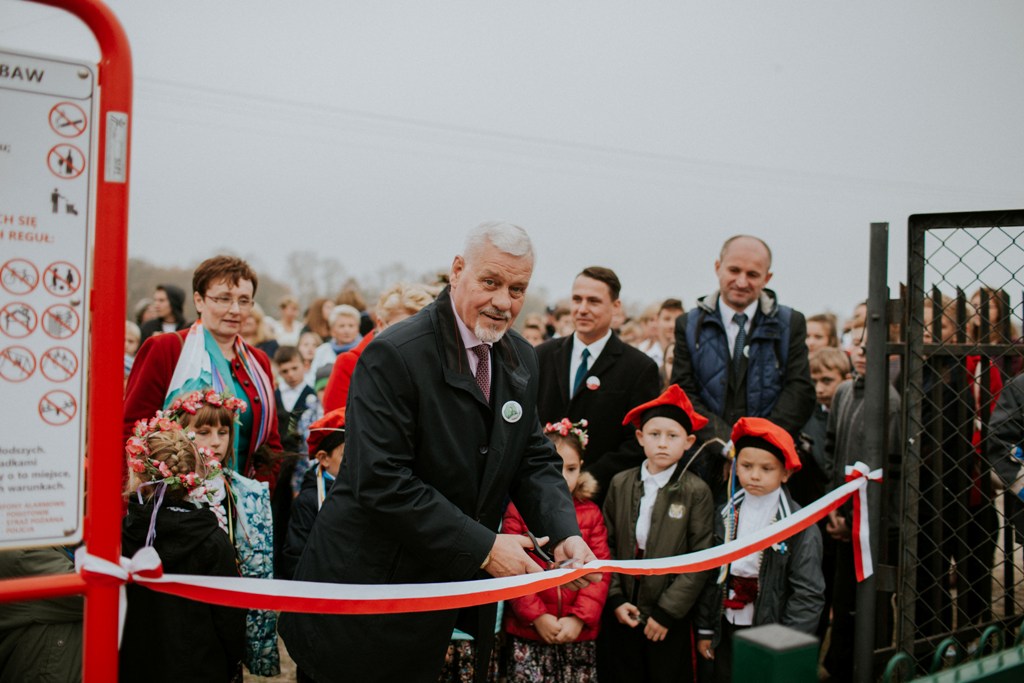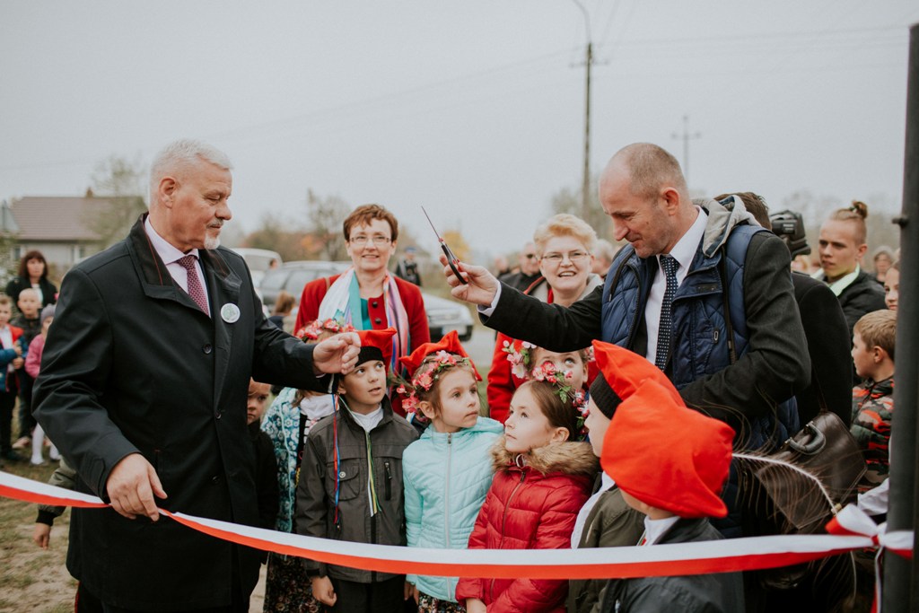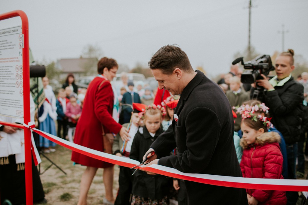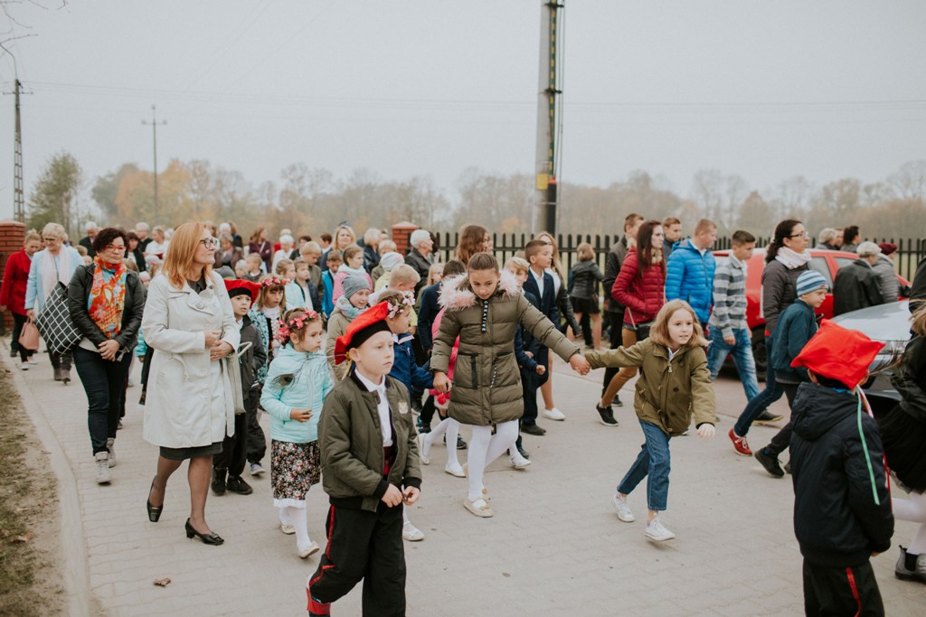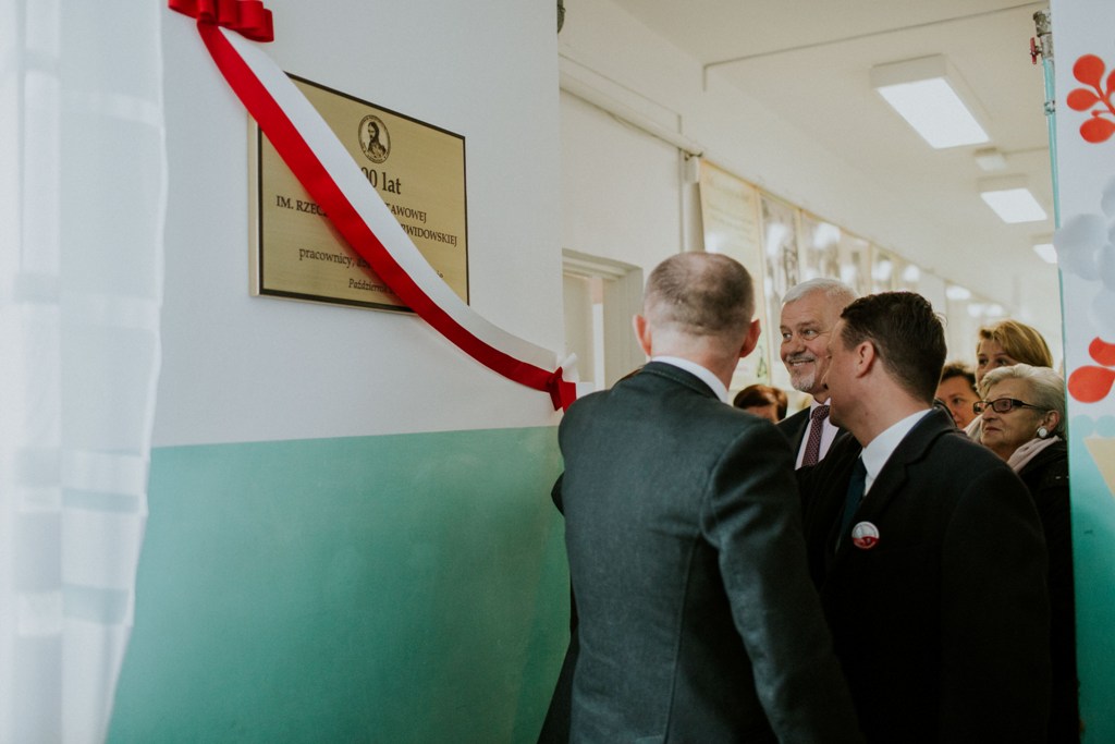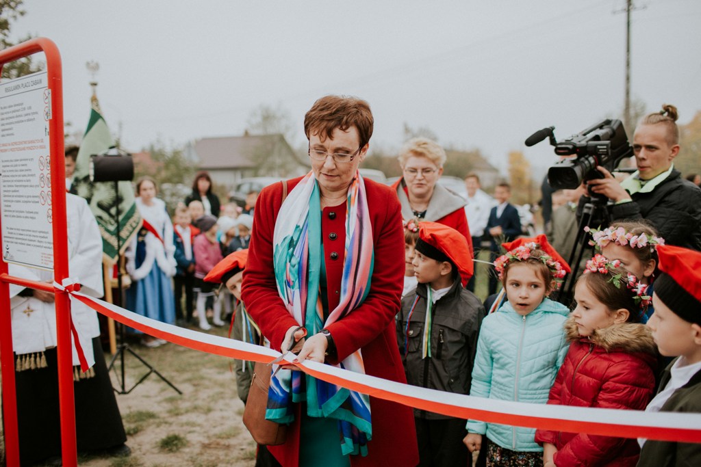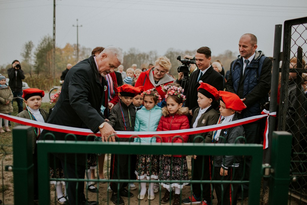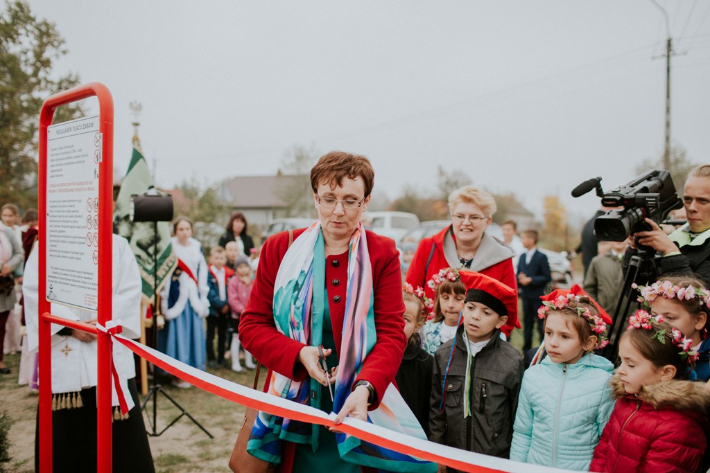 Następnie zebrani udali się do szkoły. Pierwszy przystanek pochodu zaplanowany był przy Otwartej Strefie Aktywności. To nowy plac zabaw i siłownia dla dzieci i dorosłych powstała staraniem wójta Piotra Orzechowskiego i Rady Gminy. Przecięcia wstęgi dokonali starosta powiatu wołomińskiego p. Kazimierz Rakowski, wójt Gminy Strachówka, wizytator Mazowieckiego Kuratorium Oświaty w Warszawie p. Grzegorz Telec, dyrektor szkoły Grażyna Kapaon i najmłodsze dzieci. Następnie odsłonięto tablicę pamiątkową 100 –lecia szkoły.