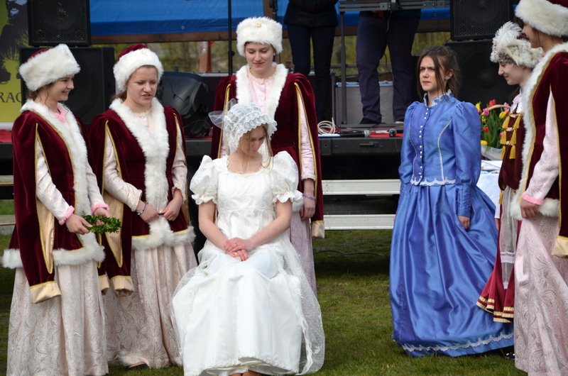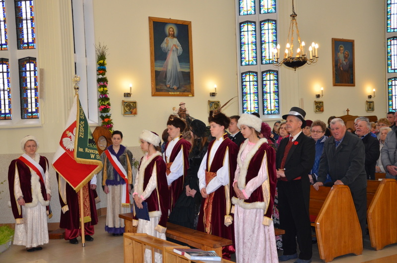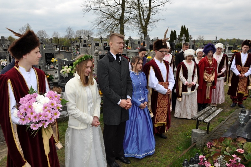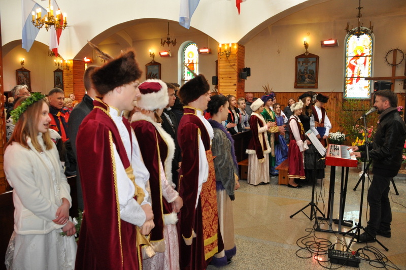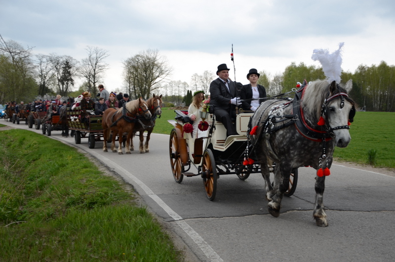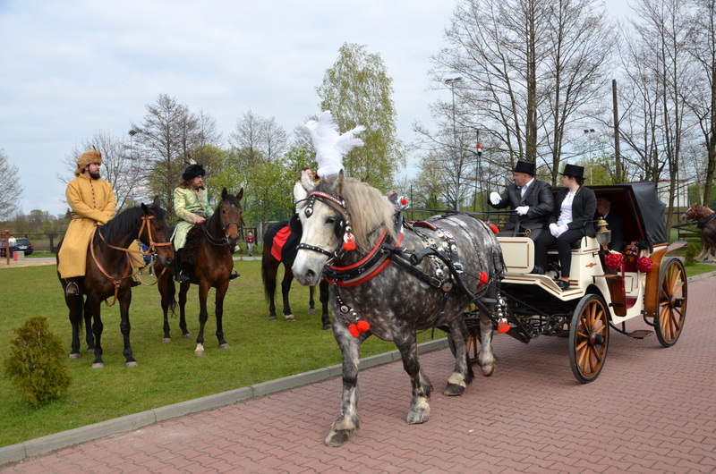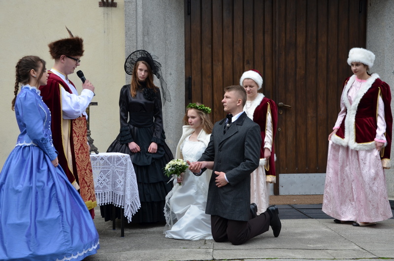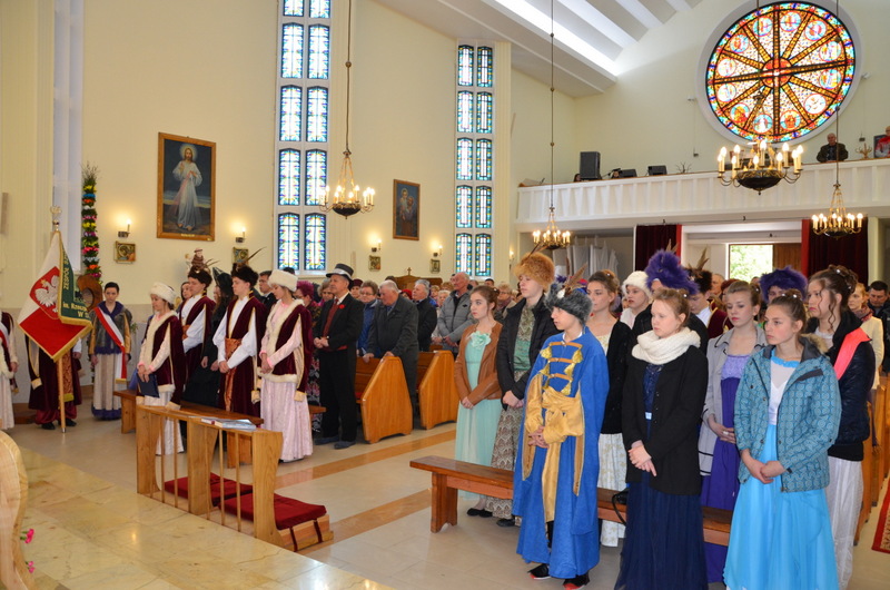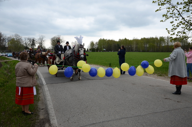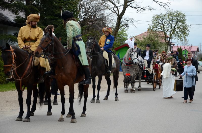 W samo południe w kościele p.w. Wniebowzięcia NMP Mszę świętą, na której modliliśmy się w intencji rodziny Sobieskich i Norwidów odprawił w koncelebrze z ks. Janem ksiądz proboszcz Mieczysław Jerzak. Po Mszy św. na stopniach kościołach rozpoczęła się rekonstrukcja szlacheckiego wesela Ludwiki Ździeborskiej i Jana Norwida. Goście obejrzeli moment oświadczyn i zaręczyn w dworze Hilarii i Józefa Sobieskiego po czym w korowodzie za ułanami ze Stowarzyszenia I Pułku Ułanów Krechowieckich z Kobyłki, bryczkami i wozami wyruszyli do Sulejowia. Po drodze korowód zatrzymywał się przy tradycyjnych „weselnych bramkach” przygotowanych przez panie z Kół Gospodyń Wiejskich ze Strachówki, Jadwisina i Równego. W kościele p.w. Trójcy Świętej uczestniczyliśmy w przepięknym koncercie Piotra Kajetana Matczuka „Rozmowa z piramidami”, który śpiewał utwory polskich romantyków. Fragment „Promethidiona” Norwida „bo nie jest światło, by pod korcem stało, ani sól ziemi do przypraw kuchennych. Bo piękno na to jest, by zachwycało do pracy, praca, by się zmartwychwstało” zaśpiewali wszyscy aż kilka razy. Po zaślubinach orszak wrócił do Strachówki, po drodze zatrzymując się przy miejscowym cmentarzu. „Młoda para” i „szlachta” złożyła kwiaty na grobie ks. Jakuba Dosta i ojca karmelity, do 1893 roku proboszcza parafii Sulejów.