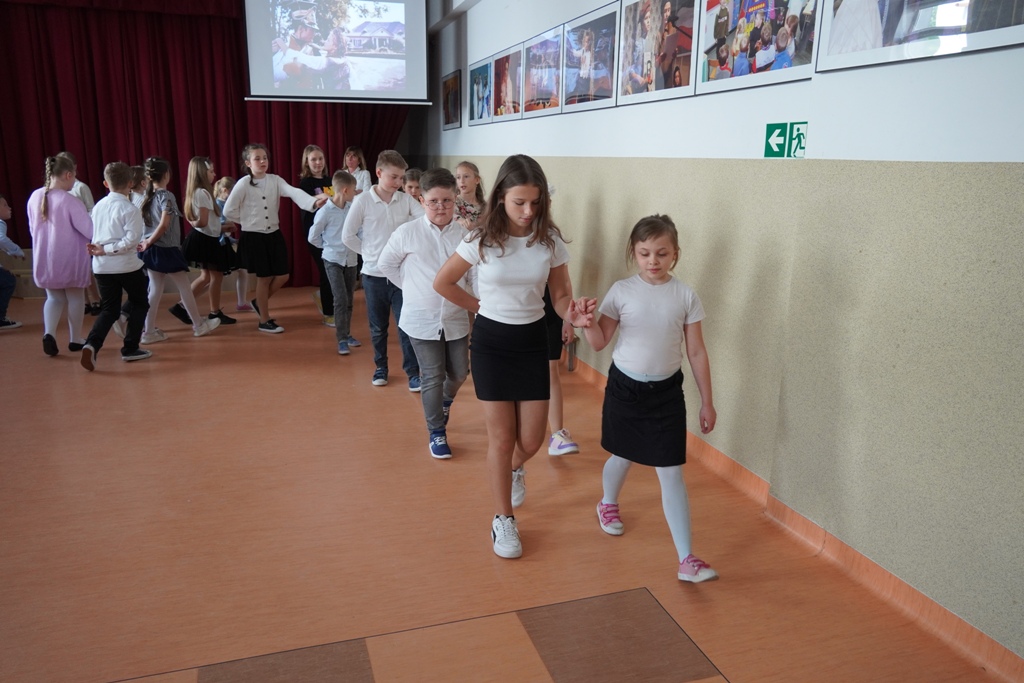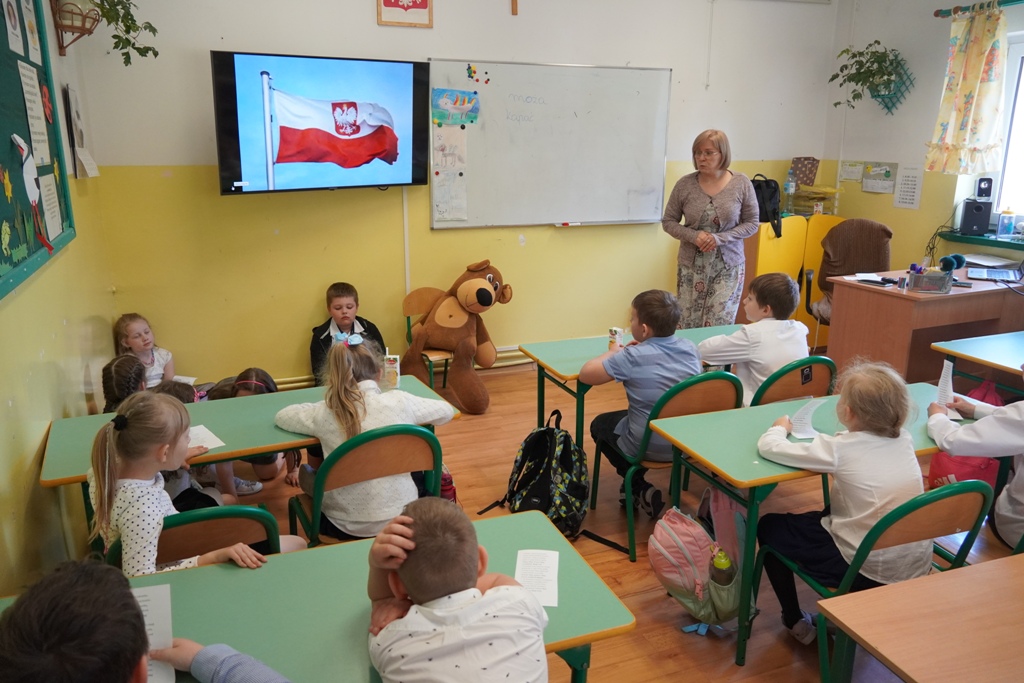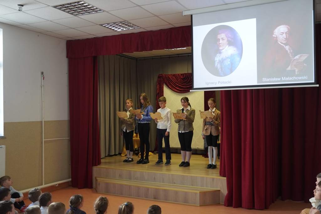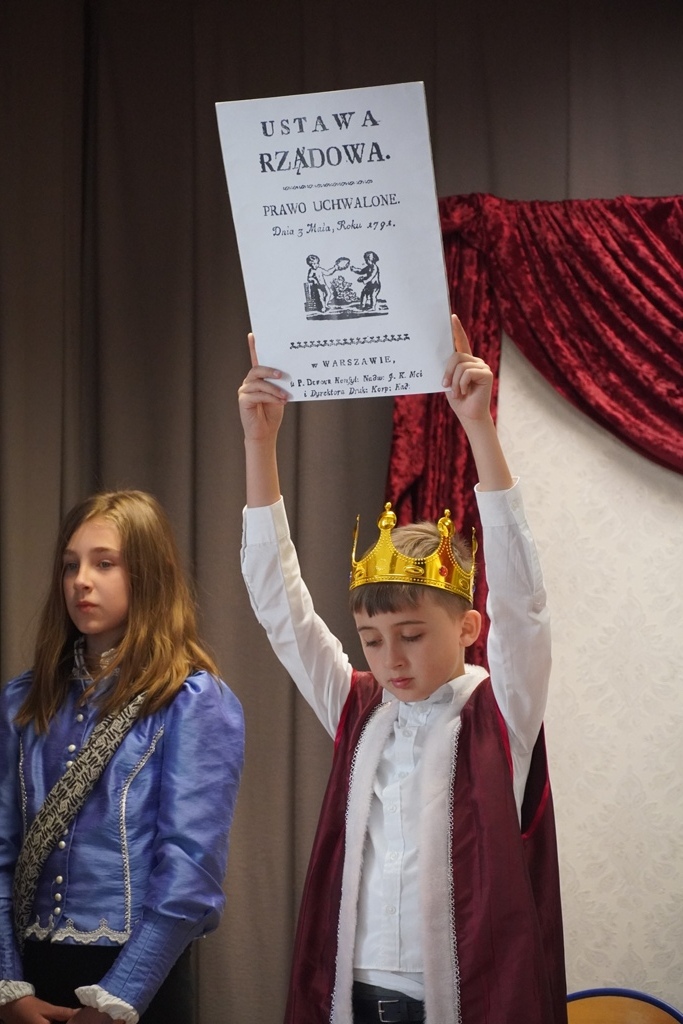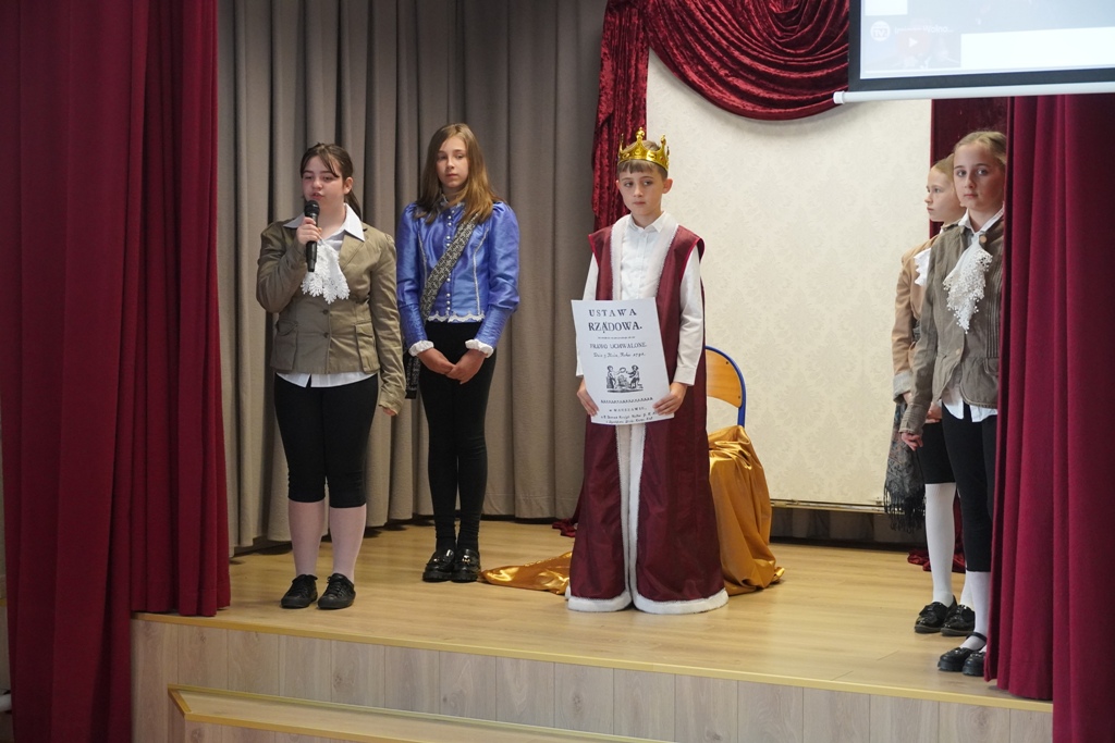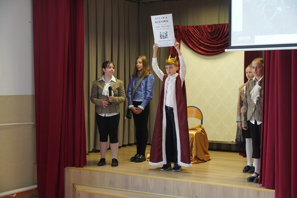 Z okazji Święta Konstytucji 3 Maja grupa uczniów z klasy czwartej i szóstej przedstawiła nam interpretację tamtych wydarzeń. Następnie cała społeczność szkolna została zaangażowana w spacer interaktywny w grupach: były zagadki, zadania plastyczne, muzyczne oraz taneczne.