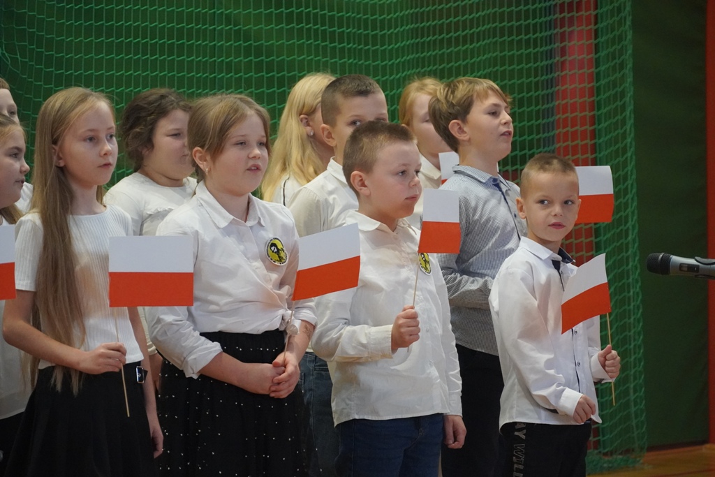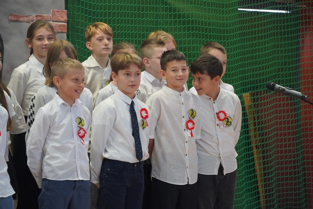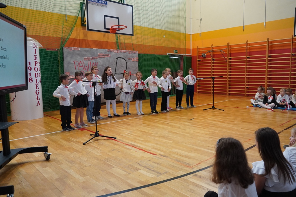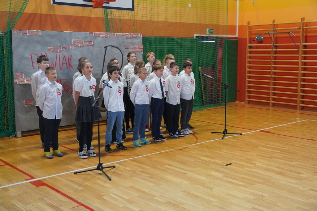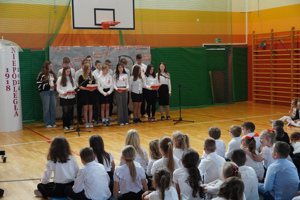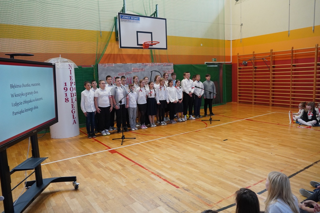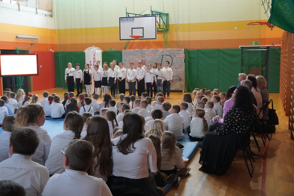 W ramach obchodów Święta Niepodległości, spotkaliśmy się w piątek na sali gimnastycznej, aby zaśpiewać pieśni patriotyczne. Każda klasa musiała przygotować jeden utwór, aby go lepiej zrozumieć, występy przeplatały się z ciekawym komentarzem p. Emili. Jest to wyjątkowe wydarzenie, którą tworzy cała społeczność szkolna, tutaj nie ma biernej publiczności. O godzinie 11:11 zaśpiewaliśmy hymn Rzeczypospolitej Polskiej, w ramach akcji Szkoła do hymnu.