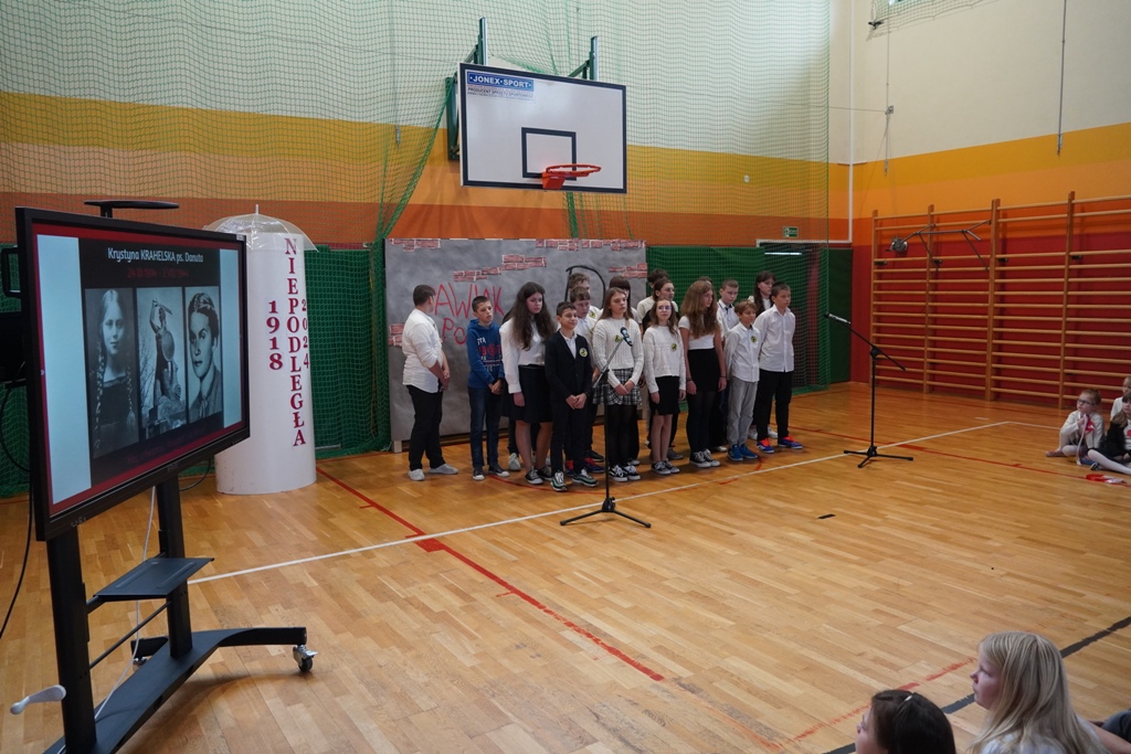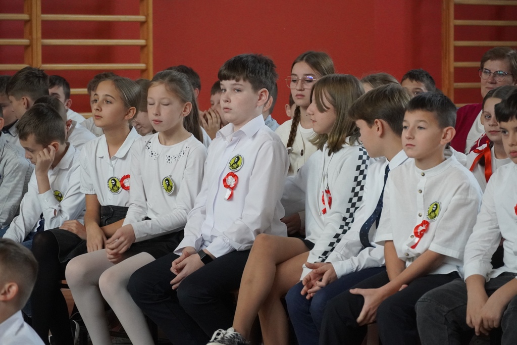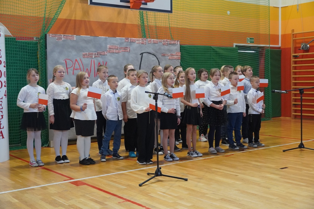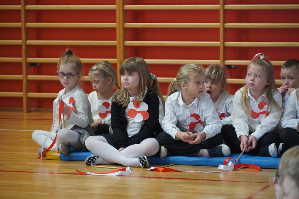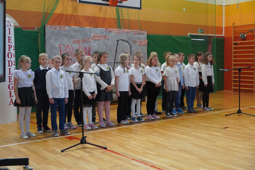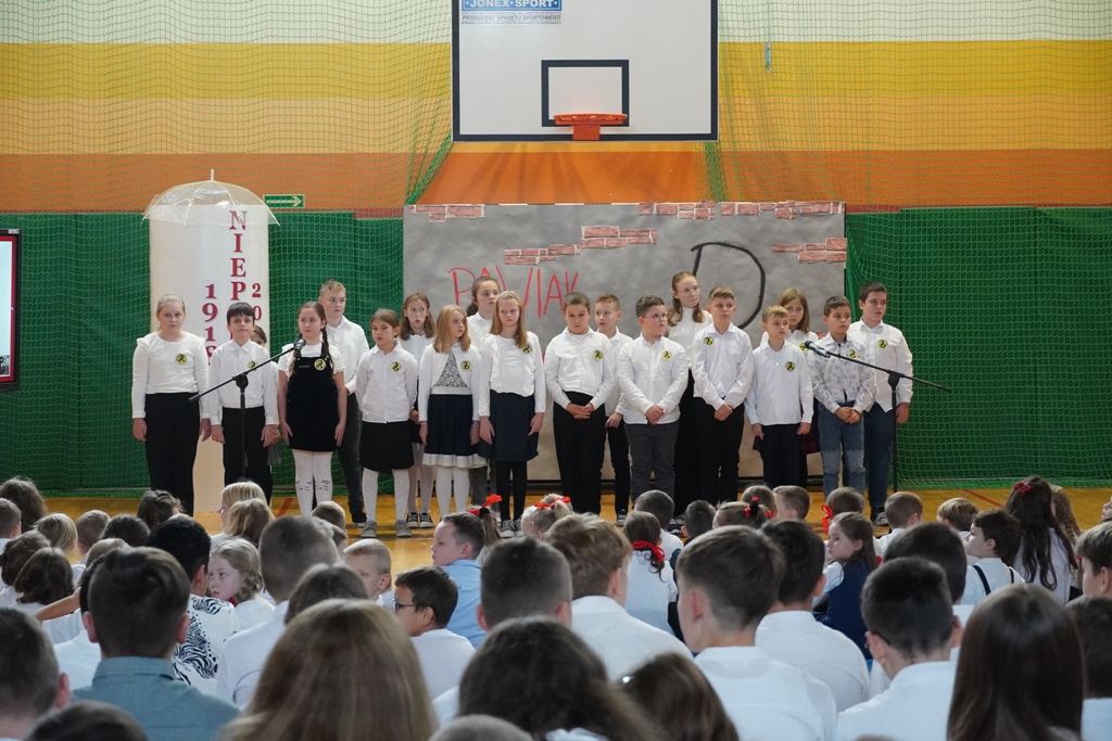 W ramach obchodów Święta Niepodległości, spotkaliśmy się w piątek na sali gimnastycznej, aby zaśpiewać pieśni patriotyczne. Każda klasa musiała przygotować jeden utwór, aby go lepiej zrozumieć, występy przeplatały się z ciekawym komentarzem p. Emili. Jest to wyjątkowe wydarzenie, którą tworzy cała społeczność szkolna, tutaj nie ma biernej publiczności. O godzinie 11:11 zaśpiewaliśmy hymn Rzeczypospolitej Polskiej, w ramach akcji Szkoła do hymnu.