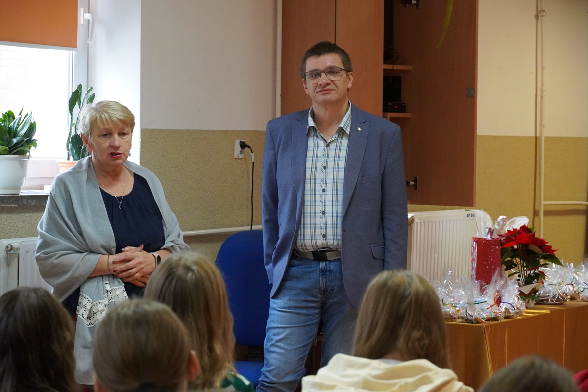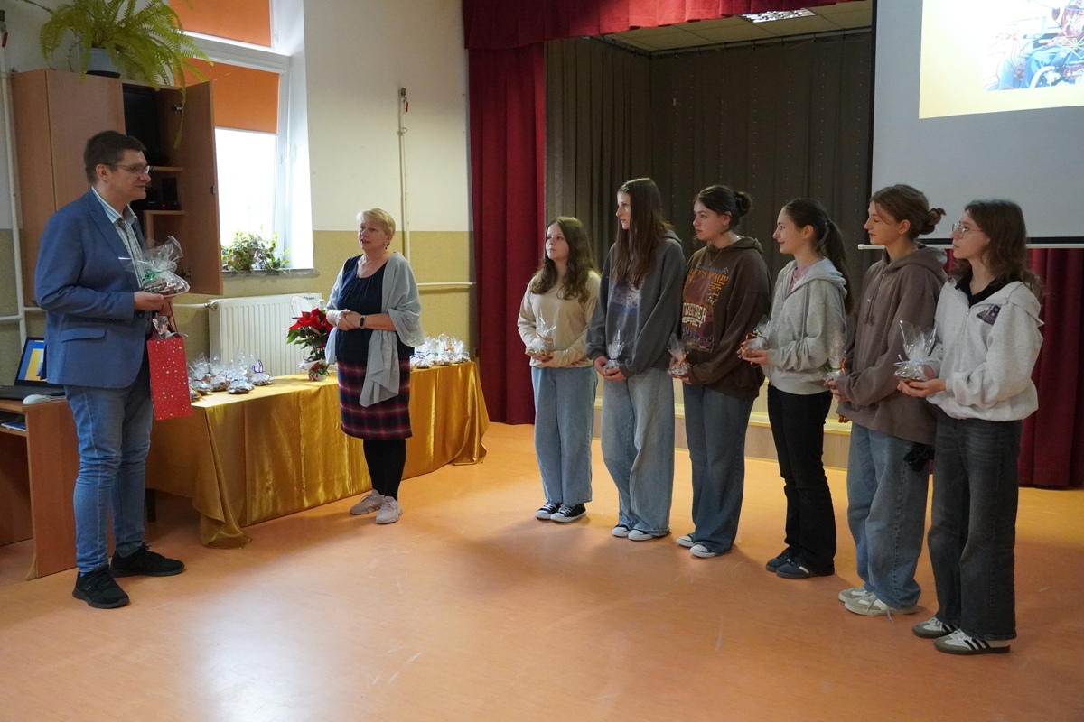 Szkolne Koło Caritas jest organizacją wolontariacką. W tym dniu naszą szkołę odwiedził nas pan Wojciech Marciniak- pracownik Warszawskiego Hospicjum dla Dzieci (od wielu lat SKC wspiera finansowo tę instytucję). Przedstawił zebranym wolontoriuszom prezentację pokazującą jej działalność i odpowiedział na zadane przez nich pytania. Na zakończenie spotkania na ręce pana Wojciecha zostały wręczone świąteczne upominki dla podopiecznych Hospicjum i jego pracowników.